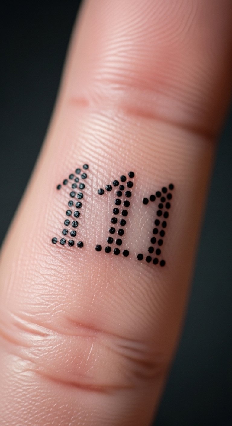 Opt for dot work with 111 on your finger. Tiny dots form the numbers for a subtle look. Practice with a dotting tool from your art kit. Choose a finger for constant visibility.