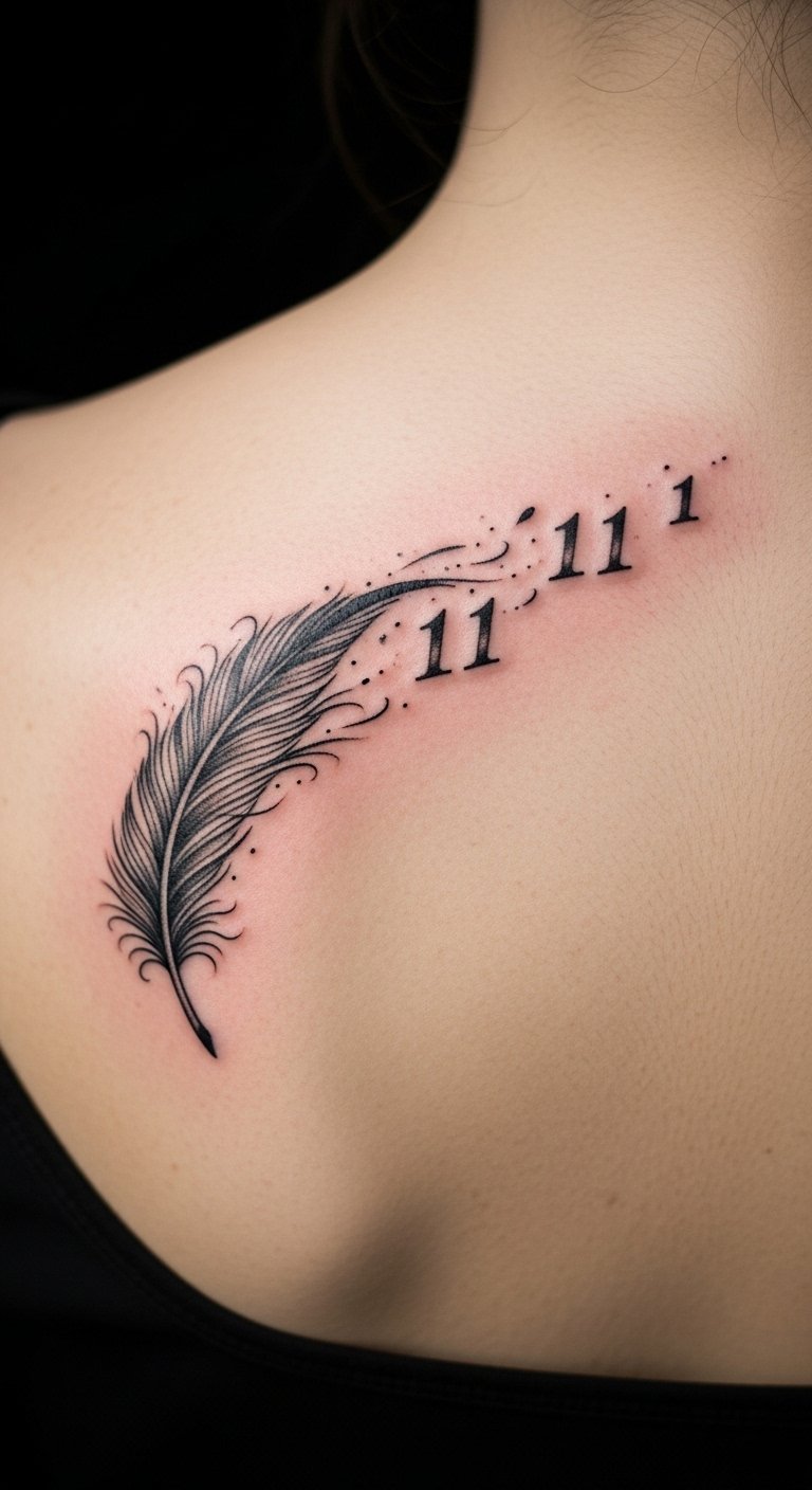Let 111 drift from a feather on your shoulder blade. Add lightness to the design. Sketch feathers lightly. Choose this spot for grace.