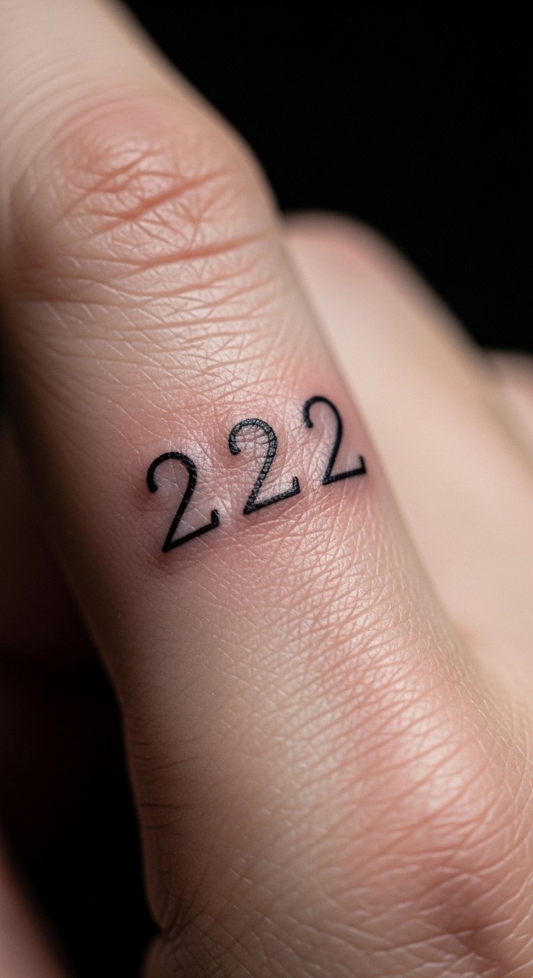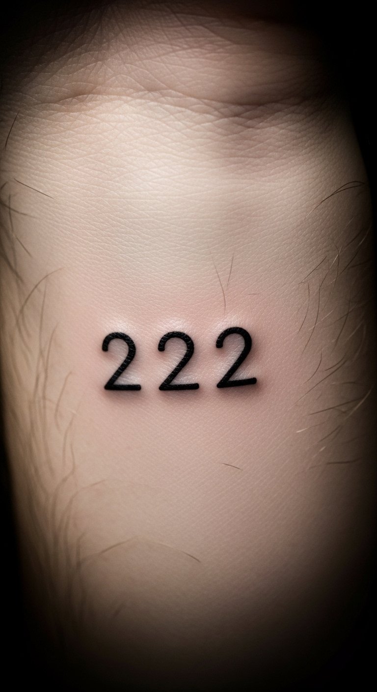 A simple 222 on your wrist keeps things easy and meaningful. This design stands for balance in daily life. Pick a small size to fit your style. Go for black ink to cut costs. Draw a quick sketch at home with a pen. Add it to an existing spot on your arm. Talk to a nearby artist for quick sessions. Use online templates for free ideas. Keep the lines straight for a neat look. This choice works for first-timers. Try it during a break from work. Focus on what 222 means to you. Get feedback from friends before booking. Wear a band to test the feel. Save by avoiding colors. Make it a weekend project.