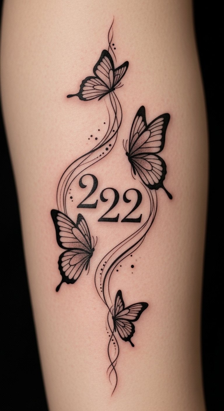 Pair 222 with a butterfly for a transformation vibe. The combo shows growth and change. Choose a small butterfly next to the numbers. Opt for basic tools if drawing at home. Use free apps to mix designs. Place it on your shoulder for easy hiding. Chat with an affordable artist online. Add colors with markers for practice. Keep the butterfly simple to save time. This idea suits personal milestones. Snap a photo of your sketch to share. Go for one session to keep expenses low. Focus on the message of hope. Test with temporary ink first. Make it your own story.