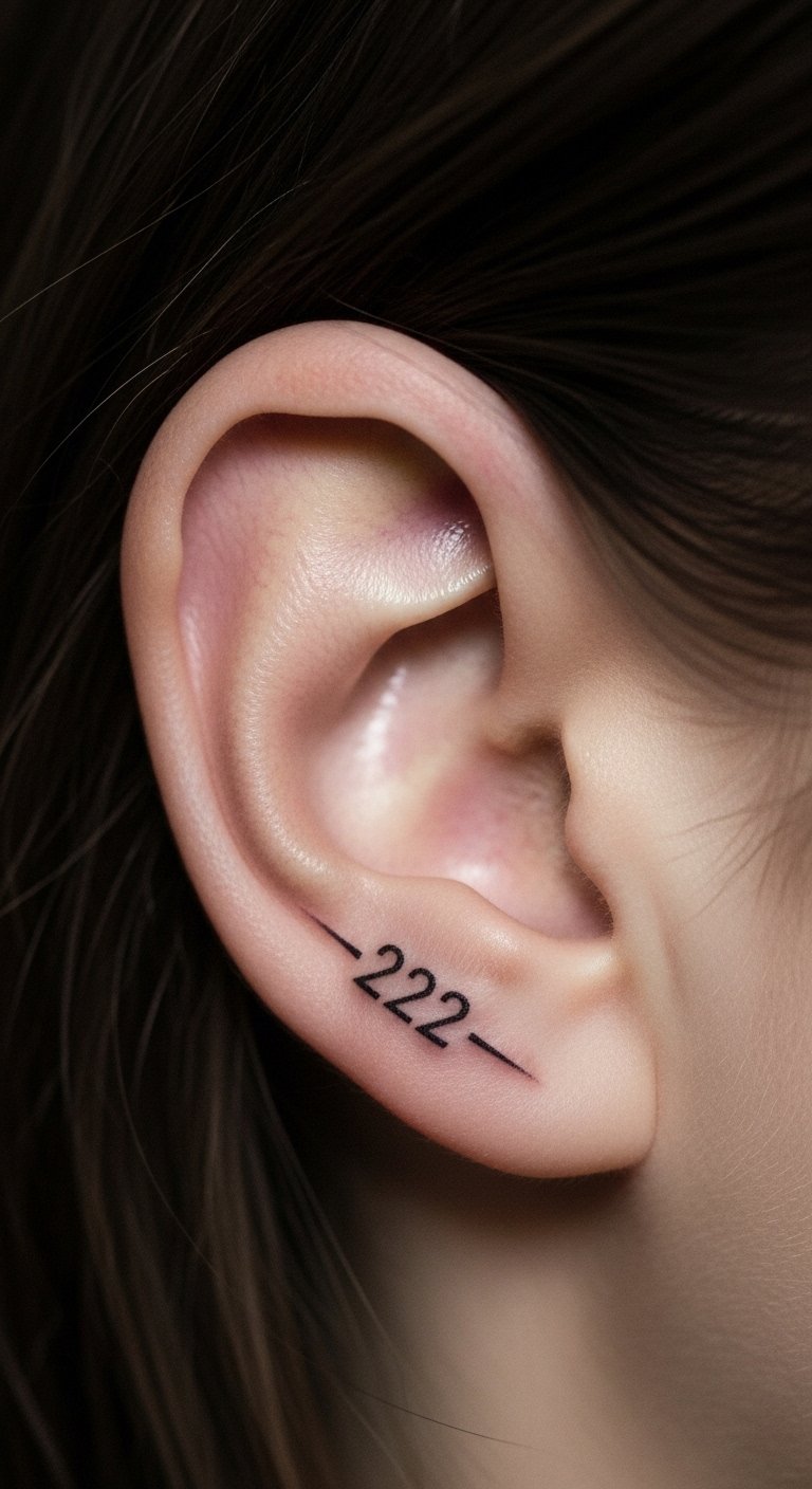 Tuck 222 behind your ear for a secret sign. It offers quiet encouragement. Draw it small on paper first. Use free ear placement guides. Hide it under hair for daily life. Check for affordable artists locally. Sketch with a fine-tip marker. Opt for simple lines to save. This works for subtle changes. Capture your idea in a photo. Plan a brief tattoo visit. Think about its guiding role. Practice with stick-on versions. Keep the process light.