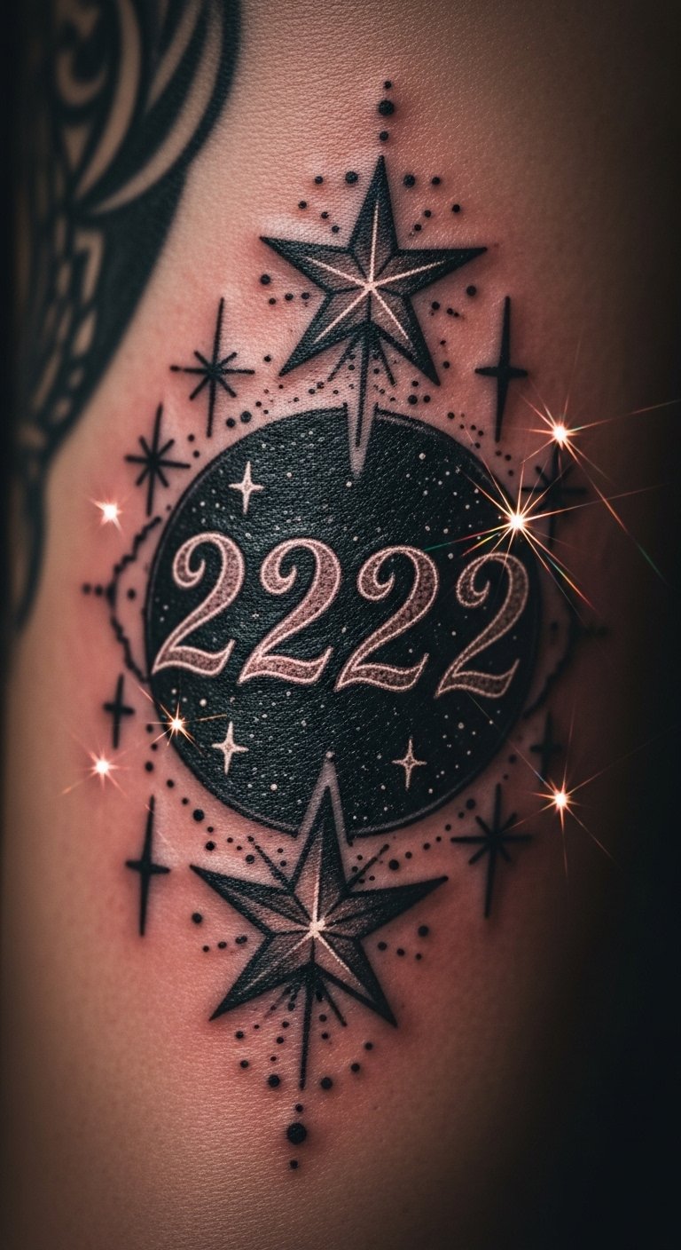 Add stars to 222 for a guiding light. Stars represent clear paths. Sketch stars simply at home. Access free star designs online. Place it on your shoulder blade. Pick an artist with fair prices. Practice with star stickers. Keep it starry but basic. This idea lights up journeys. Show your work to others. Set up a quick visit. Emphasize the direction theme. Try glow-in-dark options cheaply. Make drawing easy.
