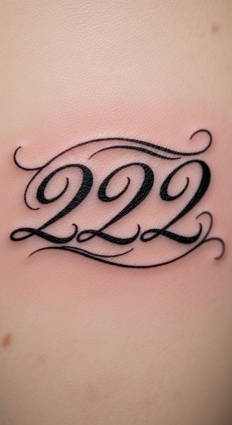 Write 222 in script for a personal flow. Curvy letters show inner peace. Practice script at home. Get free font ideas online. Put it on your forearm. Choose a budget script artist. Use calligraphy pens for trials. Keep it flowing but simple. This design personalizes stories. Discuss with friends. Arrange an easy appointment. Highlight the growth message. Test with washable markers. Make it a creative moment.