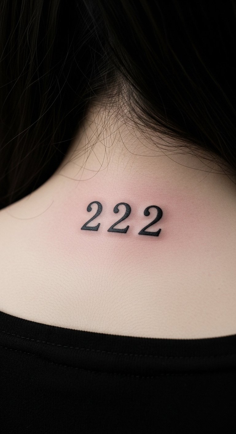 Keep 222 simple on your neck for visibility. Clean lines offer daily inspiration. Outline it on your neck area. Use free neck templates. Cover it with clothing if needed. Find a quick artist. Sketch with neck-friendly tools. Stick to basics. This idea sparks motivation. Get thoughts from friends. Book a neck session. Focus on the positive flow. Test with collar stickers. Make it an easy choice.