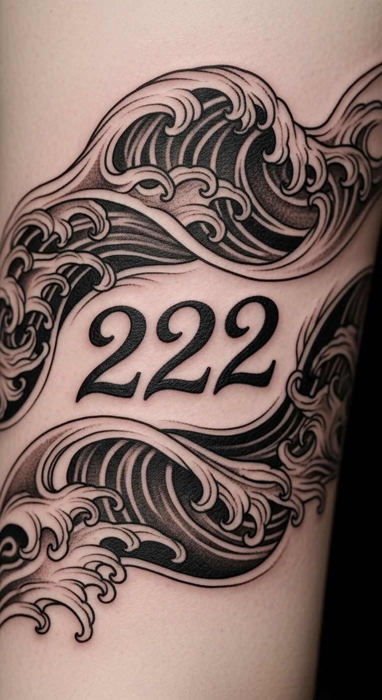 Include waves with 222 for smooth energy. Waves stand for life’s flow. Draw waves freely. Access free wave ideas. Place it on your leg. Pick a wave-savvy artist. Use paper for wave practice. Keep waves gentle. This design rides changes. Share your waves. Set up a wave session. Emphasize the harmony feel. Try water drawings. Make it a flowing activity.