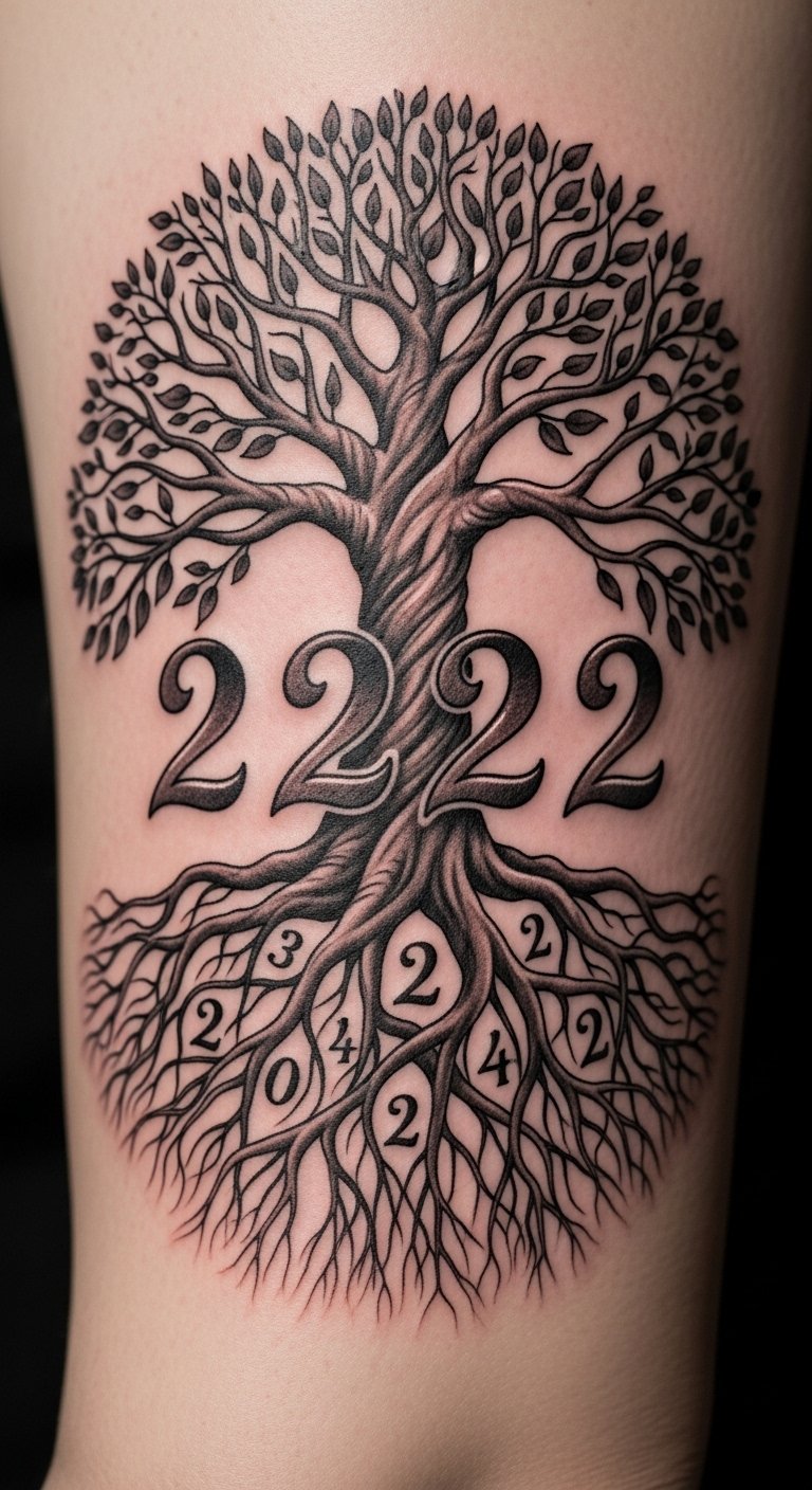 Blend 222 with a tree of life for roots. Trees mean strong foundations. Sketch trees at home. Get free tree designs. Put it on your arm. Choose a tree-focused artist. Use branches for practice. Go for a small tree. This idea grounds you. Show your tree. Plan a tree session. Highlight the growth link. Test with leaf rubbings. Make it a rooted task.