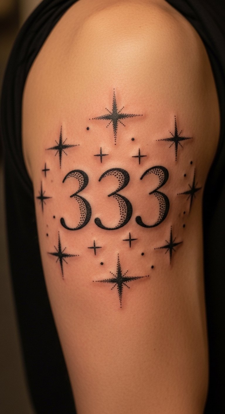 Incorporate stars with 333 for cosmic vibes. It represents guidance from above. Budget for $100 at a nearby shop. Dot stars on paper with a pen. Practice on fabric scraps. Surround numbers with simple stars. Position on your upper arm for visibility. Roll up sleeves on cool days. Tie it to night sky gazing. Divine communication comes alive. Keep dots even and spaced.