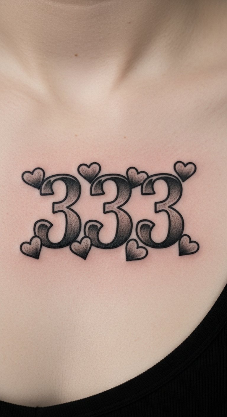 Add hearts to 333 for emotional depth. It mixes love with spirituality. Aim for $110. Draw hearts beside numbers. Test with heart stickers. Place them symmetrically. Put on your chest for heart-felt meaning. Wear tops that breathe. Tie to nurturing vibes. Motherhood and nurturing resonate. Keep hearts simple.
