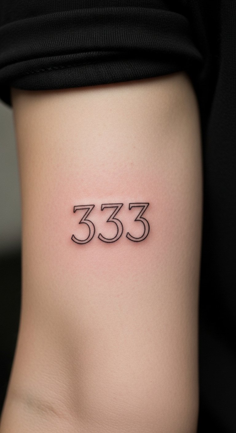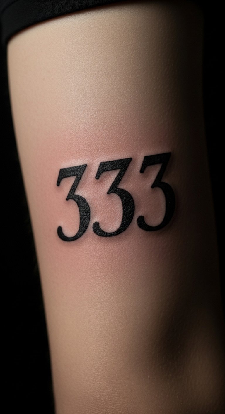 Think about a small 333 on your wrist. It acts as a daily nudge toward spiritual awareness. Get this design with basic black ink at a local shop. Costs stay low, around $50 to $100. Use a stencil kit from an online store for a DIY practice run. Draw the numbers lightly on paper first. Keep lines straight and even. Add a tiny dot for extra flair if you want. This spot hides easily under sleeves. Choose a fine-tip needle for precision. Talk to your artist about skin sensitivity. Wear it as a personal mantra for growth. Pair with daily affirmations. Angel number 333 works well for busy days. Make it meaningful by linking it to your goals.