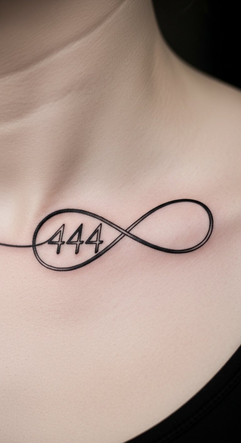 Loop 444 with an infinity sign for endless possibilities. It ties into themes of growth and change. Choose a thin line style to keep costs low. Sketch the loop on your skin with washable markers first. Search for budget-friendly tattoo spots online. Place it on your collarbone for easy glances. Turn it into a daily habit for focus. Experiment with string art at home for inspiration. This tattoo blends well with your story. Use free tools to plan your version. See it as a step toward renewal.