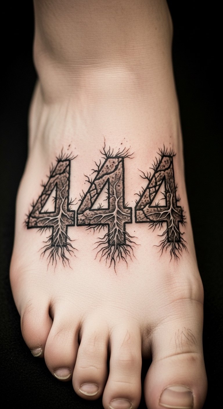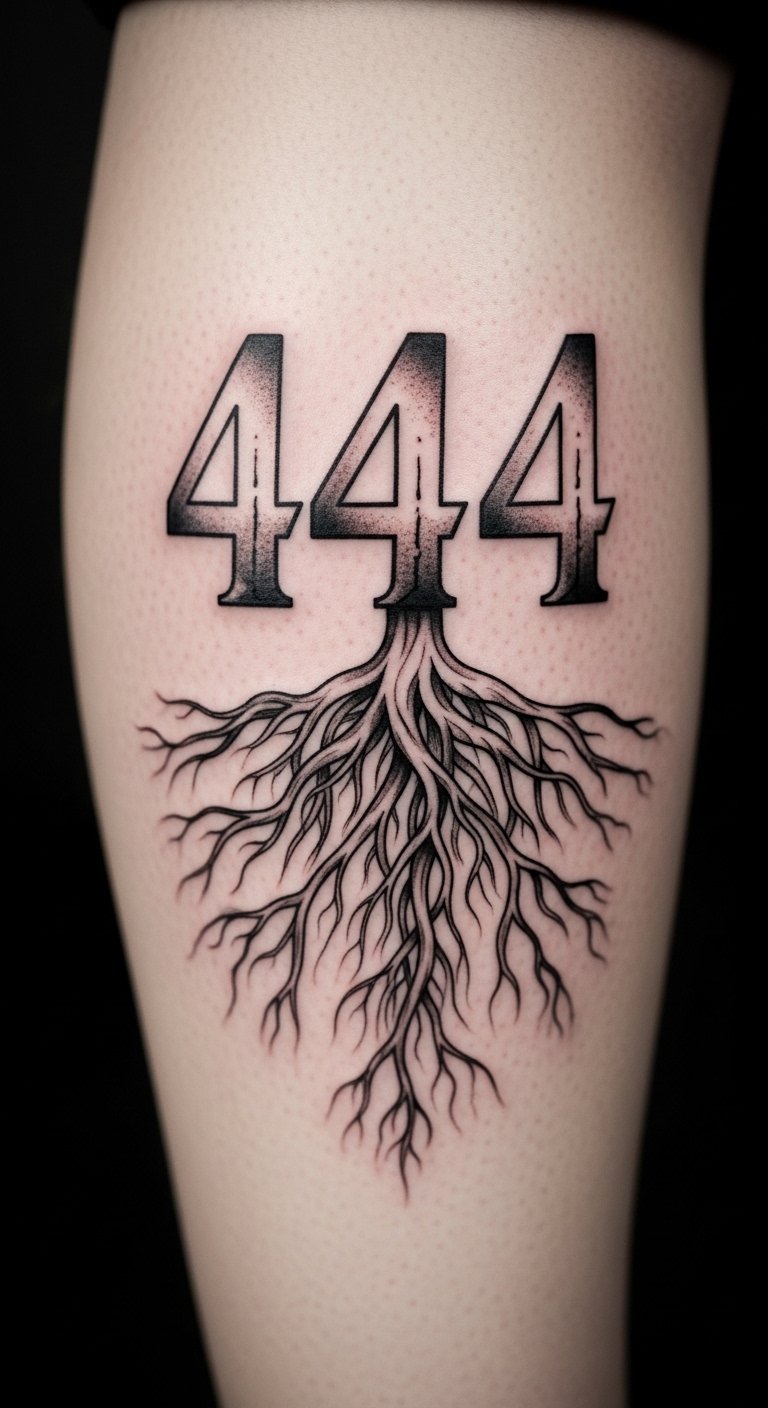 Add roots to 444 for a grounded look. It speaks to stability and deep connections. Select basic root lines for lower prices. Sketch the design on your leg with pencils. Find deals at nearby studios. Put it on your calf for a personal touch. Let it guide your daily thoughts. Create root drawings at home for practice. This tattoo roots you in reality. Use everyday items like twigs for inspiration. Keep it simple yet meaningful.