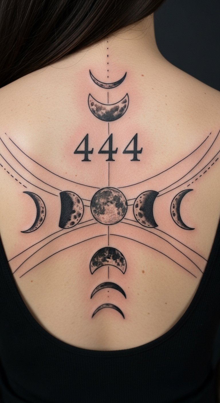 Incorporate moon phases around 444 for cycles of life. It hints at renewal and flow. Stick to simple phases to cut expenses. Draw them next to numbers on paper. Check for sales at tattoo shops. Place it on your back for a quiet spot. Turn it into a nightly reflection tool. Experiment with moon charts at home. This design cycles with your journey. Practice with circular templates. See it as a phase of growth.