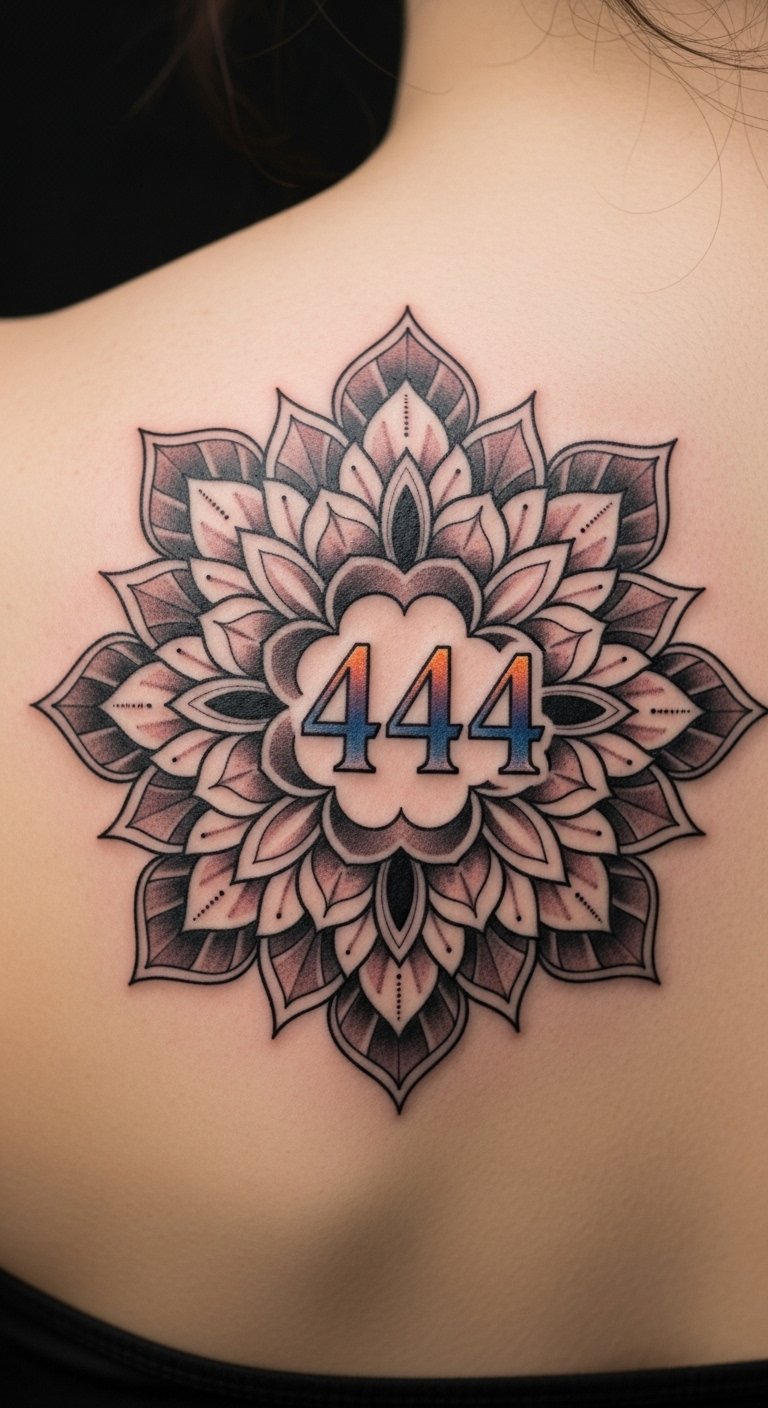 Build a floral mandala around 444 for harmony. It brings balance and beauty together. Opt for outline flowers to stay affordable. Sketch the mandala on fabric at home. Look for beginner artists with good rates. Set it on your shoulder for subtle appeal. Use it for quick centering exercises. Try flower drawings for DIY fun. This tattoo blooms with your spirit. Use free mandala templates online. Make it a focal point daily.