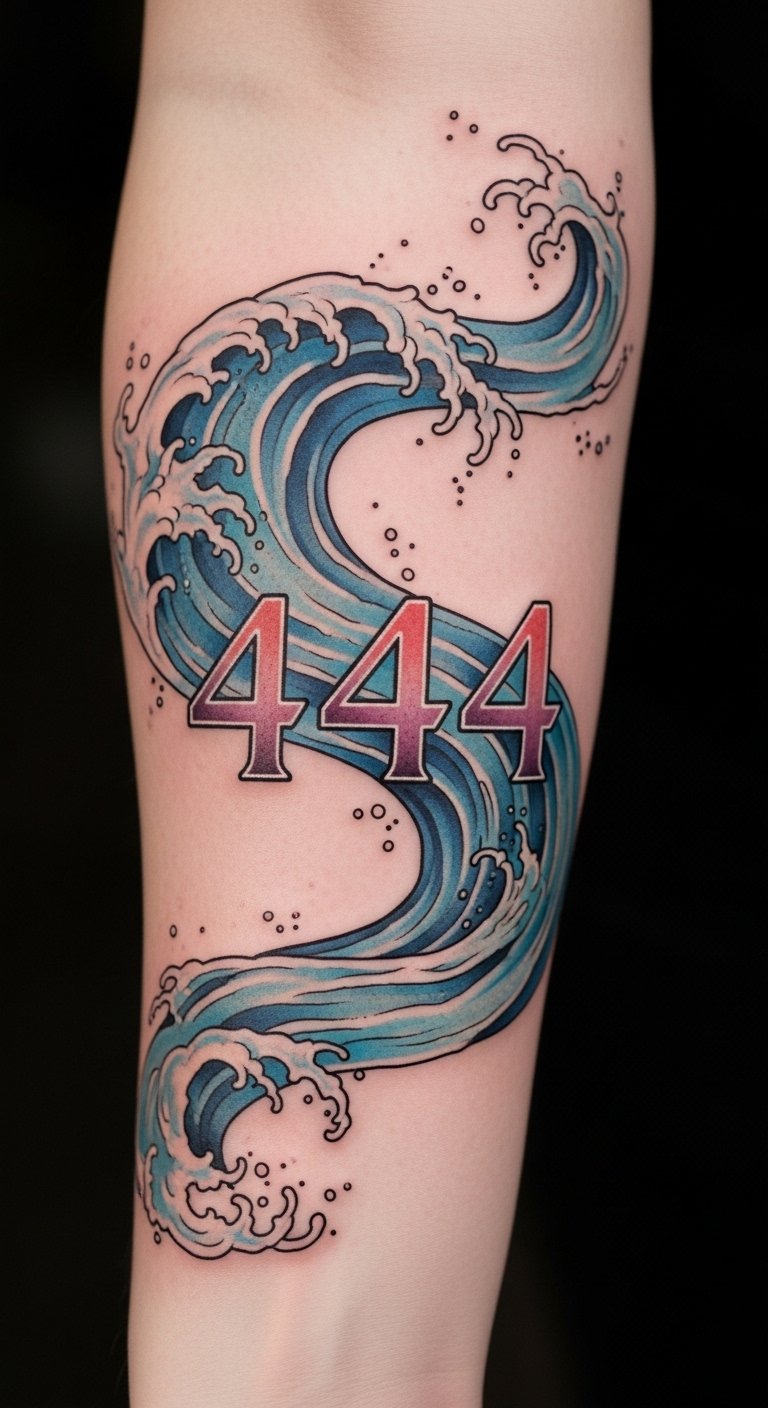 Blend 444 with watercolor waves for a fluid feel. It represents movement and emotion. Choose light colors for budget options. Practice waves on paper with paints. Find artists who do soft styles cheaply. Put it on your forearm for easy view. Let it flow into your thoughts. Create wave art at home for ideas. This design washes over your day positively. Use basic supplies for sketches. Ride the wave of change.