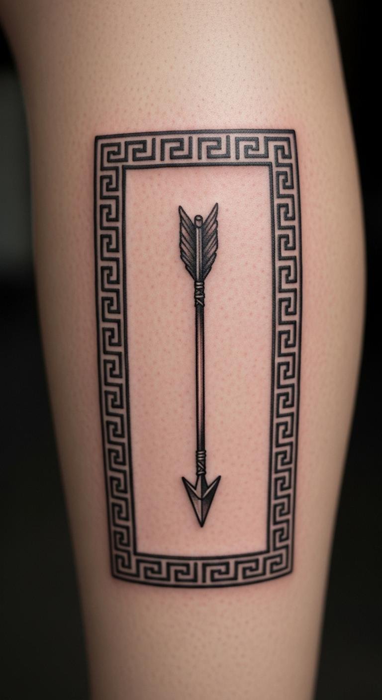 Frame your tattoo with a Greek key for structure. This border adds edge without fuss. Practice with string and paper at home. Pick artists who do patterns quickly. Key designs make it neat and symbolic. Try the calf for a hidden spot. Use free online patterns to adapt. This approach ties in the myth smoothly. Keep it basic to lower expenses. Add your twist for uniqueness. You’ll get a polished look on a budget.