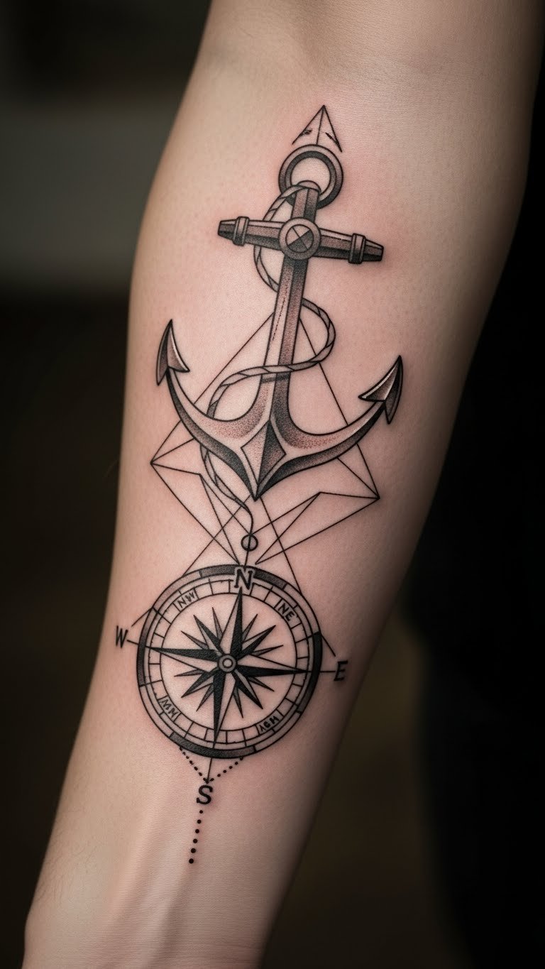 Pair your anchor with a compass for direction. This design means stability plus guidance. Lines connect smoothly for a unified look. Draw both on paper to see how they fit. Paper and pencil are free. Create a DIY version with clay, molding the shapes for under $10. Put it on your arm where you can see it daily. Expect to pay $60 for a pro job. Use basic tools to keep it straightforward. This combo offers a story in one spot.