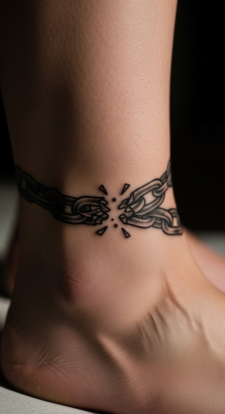 A broken chain tattoo signifies breaking free from burdens. It represents letting go of what holds you back. Easy to adapt to your life. Sketch chains on paper for fun. Find affordable options through social media. A basic design runs about $30. Hide it on your foot if needed. Try paper cutouts to visualize. Make it a step toward personal freedom.