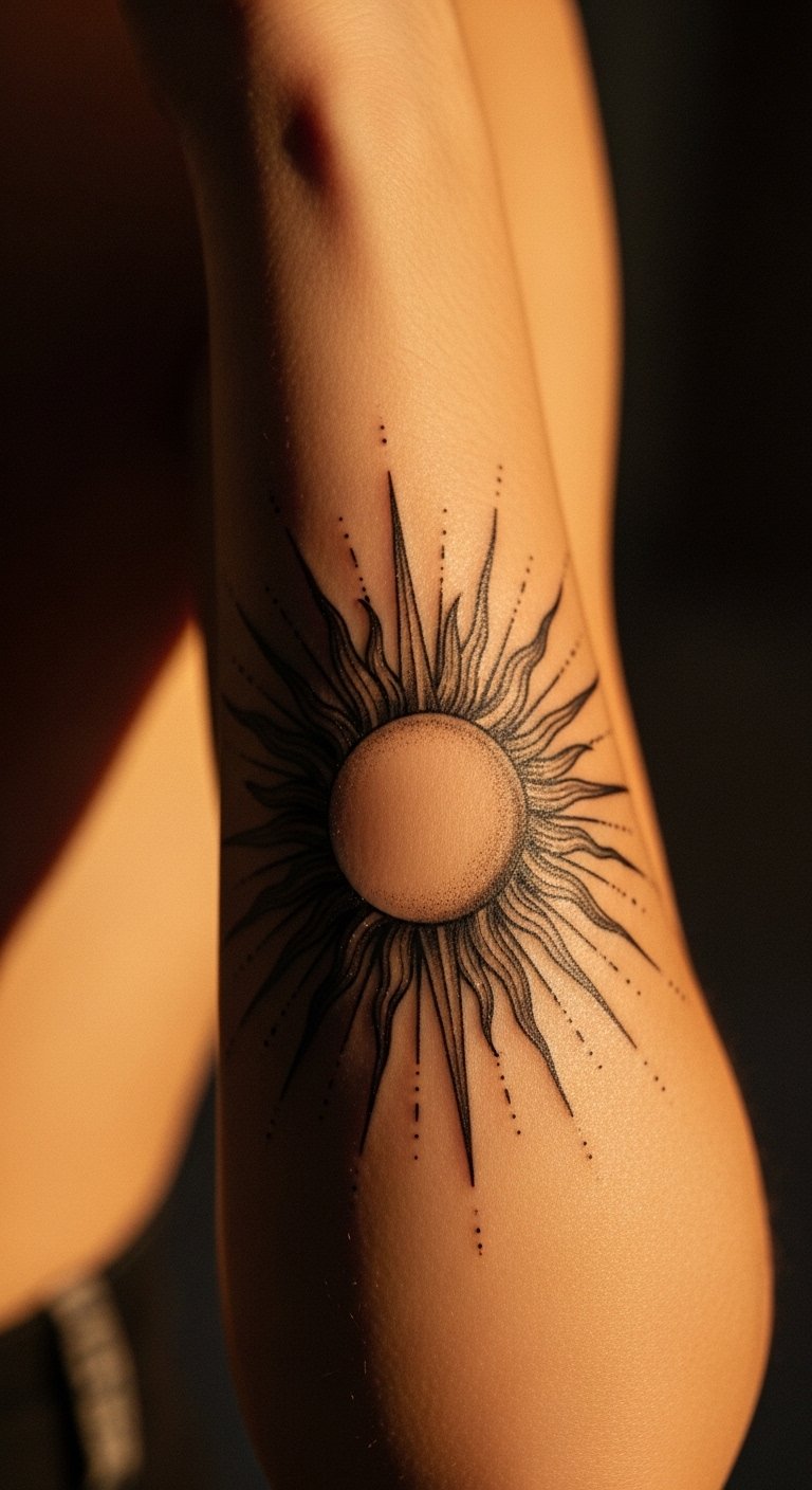 A sun tattoo means new beginnings. It shines bright daily. Draw suns in margins. Find cheap options. Less than $35. Wear on arm. Use sun templates. Welcome light.