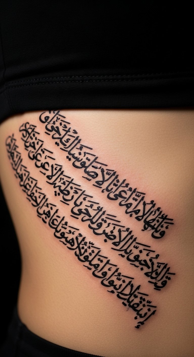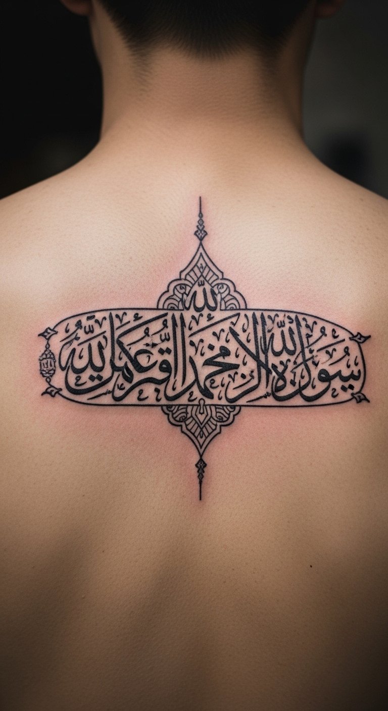 Go for something meaningful. A Quranic verse on your back adds depth to your ink. Select a favorite line and verify its translation online. Draw it out on a large paper template. Place it where it’s personal, like the shoulder blade. Opt for black and gray shades to save money. Ask a local artist for a quote on smaller sessions. Use washable ink for a home trial. Combine it with simple borders for flair. Keep the design symmetrical for balance. This idea works well for reminders of faith. Experiment with different fonts using apps. Make it a step-by-step process to ensure it’s right.