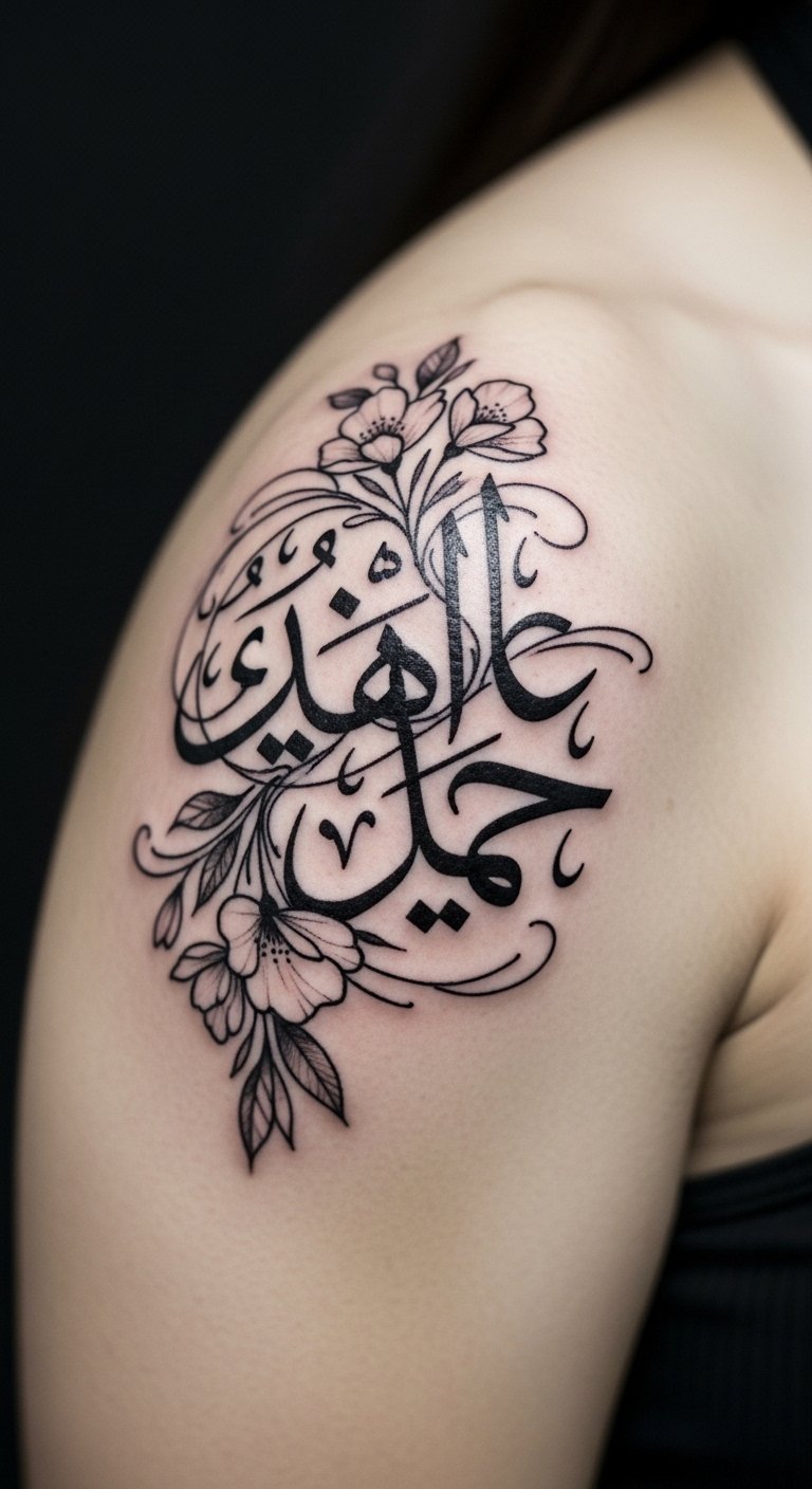Mix styles for uniqueness. Fusion with florals turns Arabic script into art. Select a word and pair it with simple flower sketches. Draw it on your body with a pen first. Place it on your shoulder for visibility. Use affordable black ink for the base. Look for artists who offer package deals. Create a DIY version with stickers. Blend the elements to flow together. This adds a soft touch to bold letters. Experiment at home with drawing tools. Make it personal and budget-friendly.