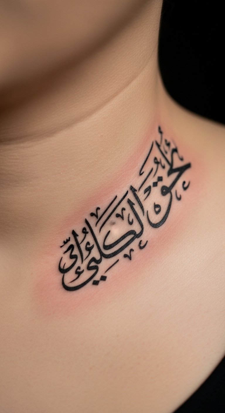 Make it about you. A personal name in Arabic on your neck says it all. Translate the name accurately using free apps. Sketch it lightly on your skin. Opt for the side of the neck for discretion. Go with single-color ink to keep prices down. Check local shops for walk-in options. Use temporary transfers for trials. Keep the script clean and simple. This idea personalizes your story. Practice with everyday items like paper.