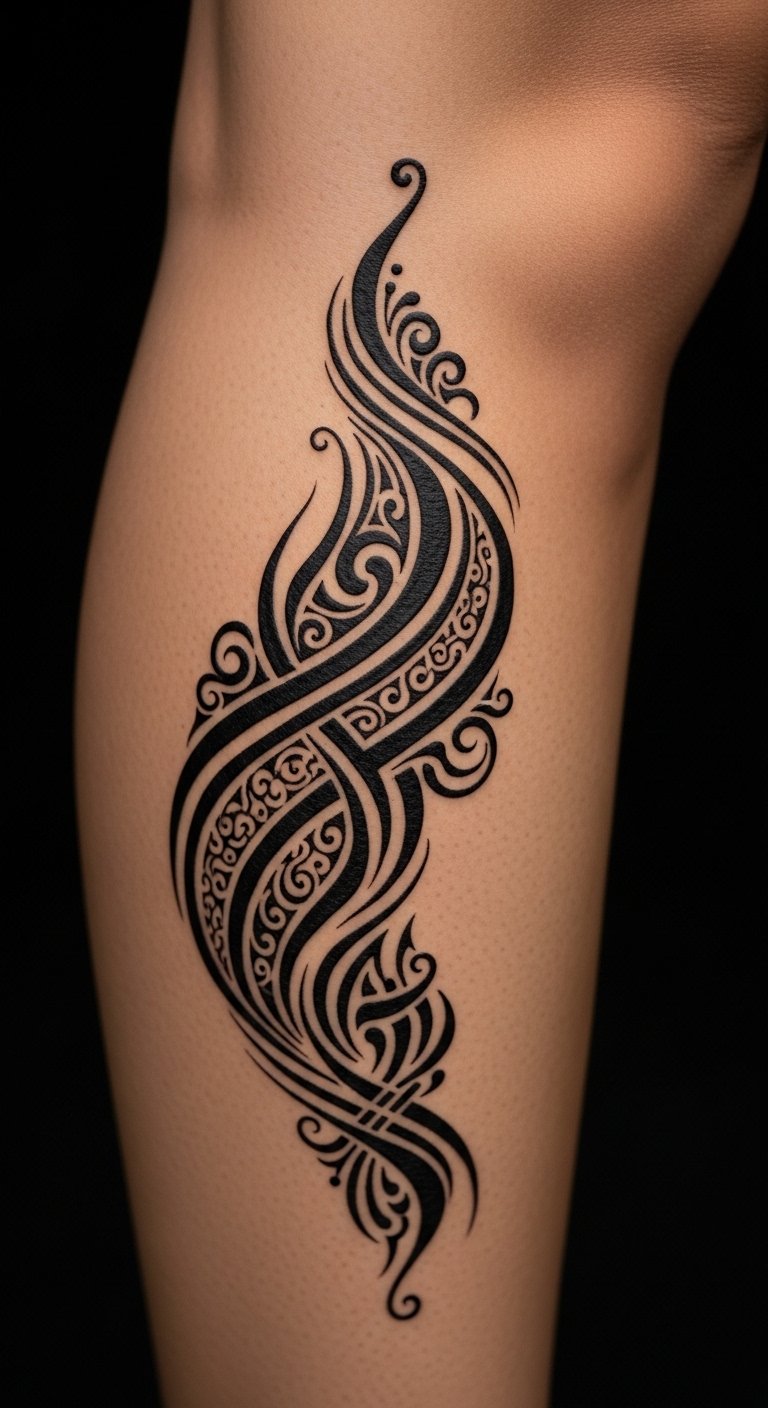 Mix worlds. Fusion with Japanese elements creates novelty. Pair script with waves and draw. Put on your leg. Opt for simple inks. Find creative pros. Test with drawings. Blend smoothly. This stands out. Experiment freely.