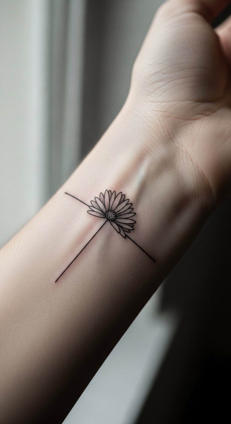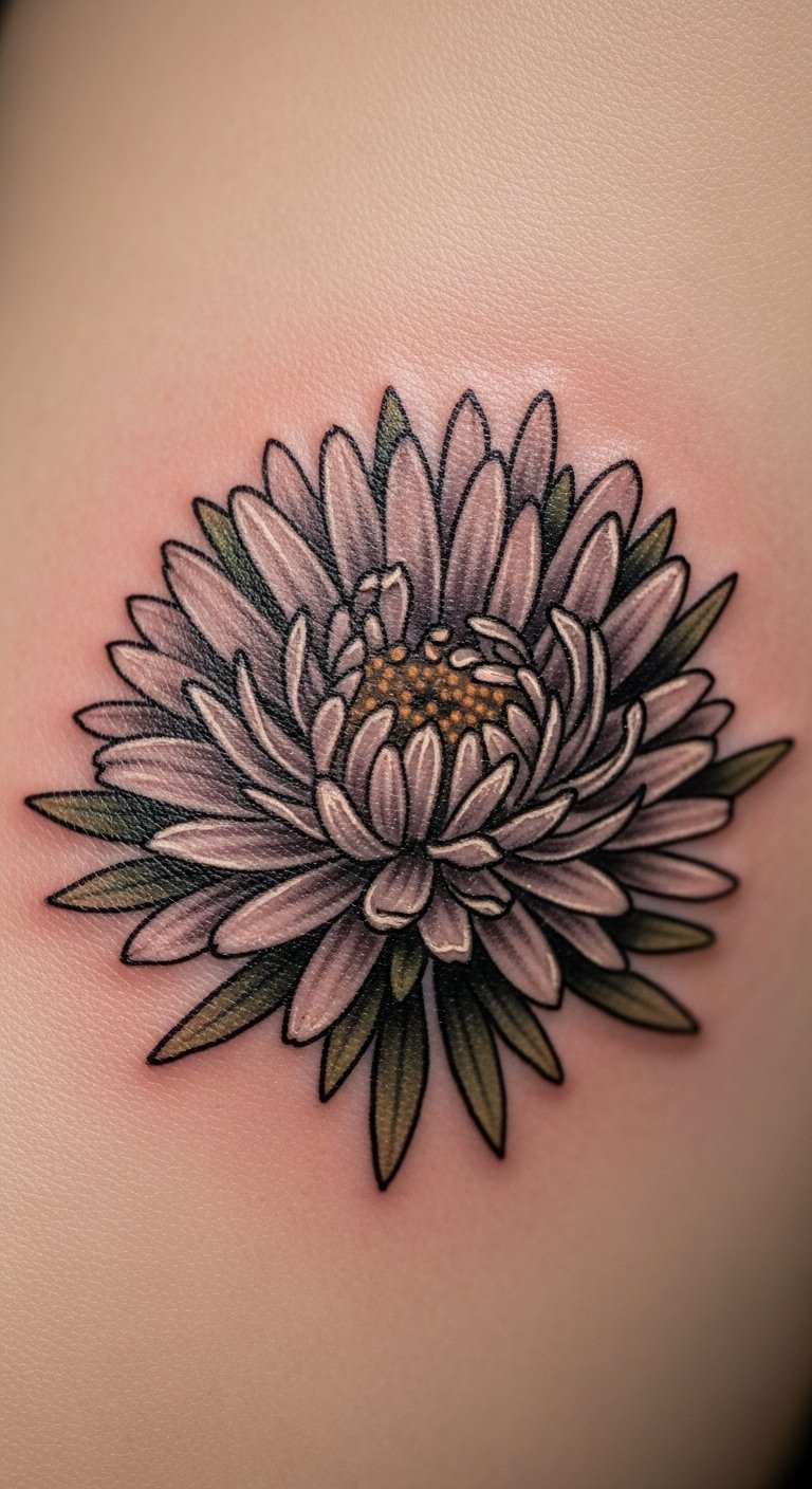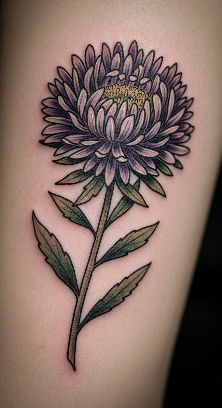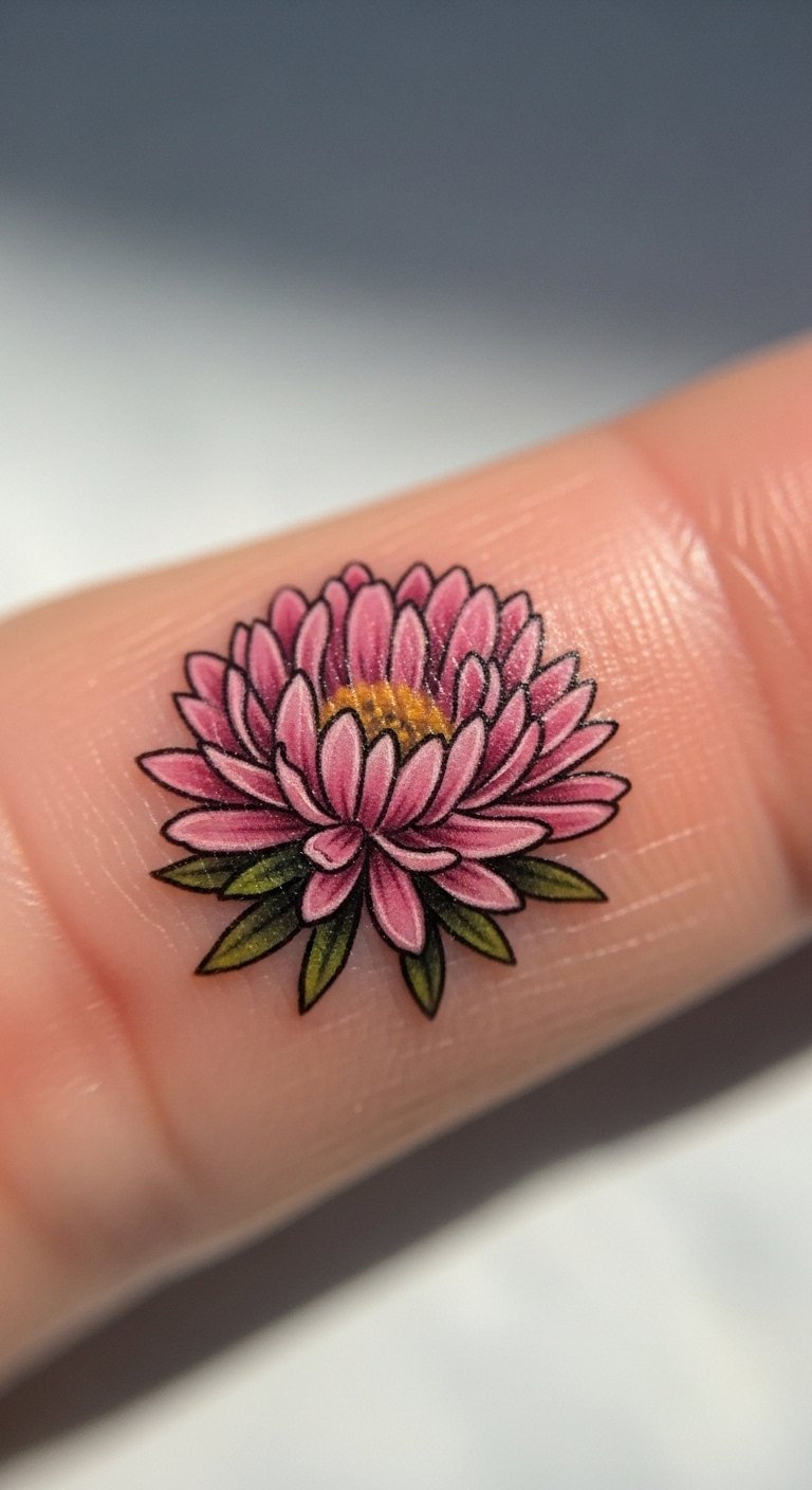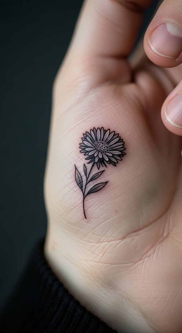 Think of a minimalist aster as your daily nudge toward inner peace. This design uses basic lines to show the flower’s star shape, perfect for folks starting their growth path. Sketch it at home with a pen and paper, tracing aster images from free online sources. Keep costs low by visiting a local artist for a small session, often under $50. Add a personal twist, like a tiny stem, to represent your quiet steps forward. Bold choices here: use black ink for timeless appeal. Practice drawing on your skin with washable markers before committing. This tattoo fits anywhere hidden, like behind your ear, for private moments of thought.
