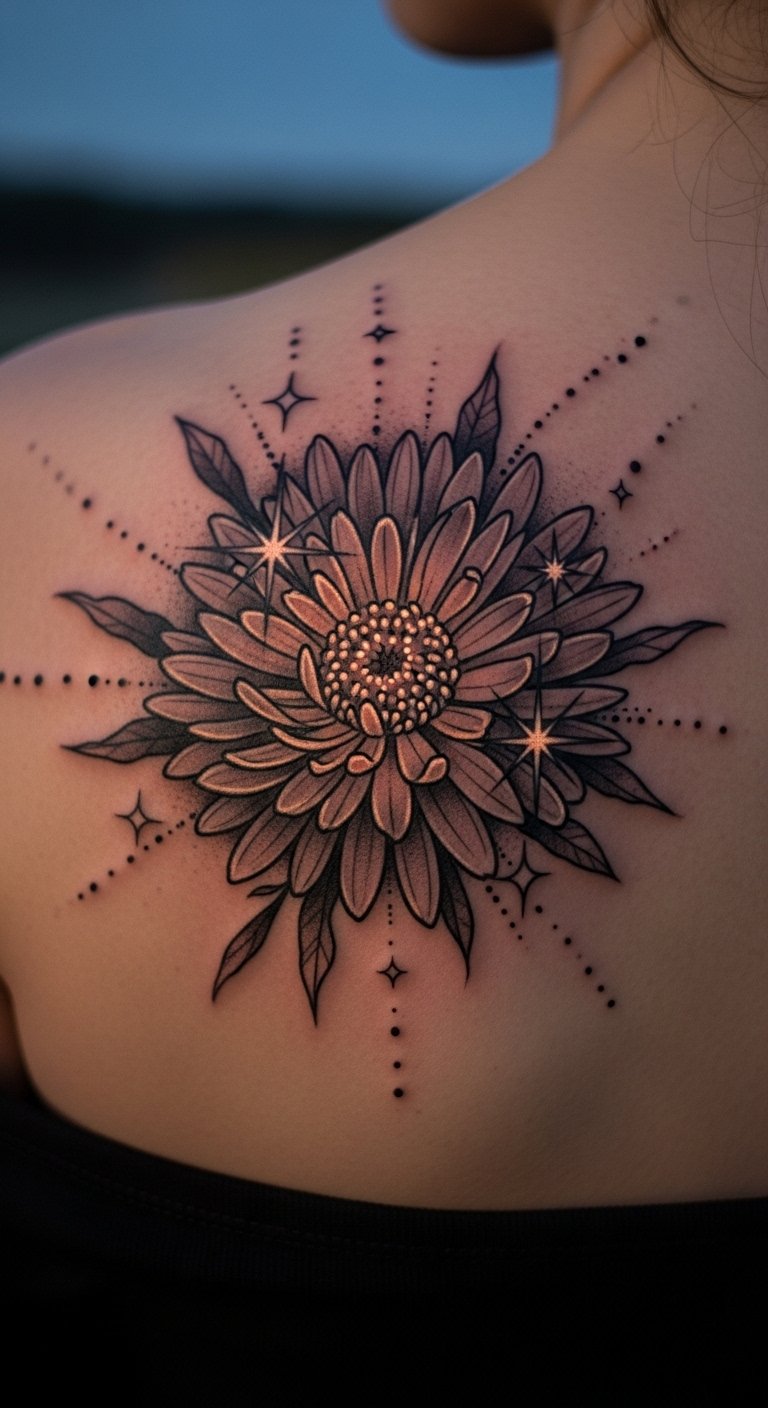 Shoulder asters offer hidden spots for inner power. Map it out on paper with a ruler for precise placement. Expect $65 at a walk-in shop. Cover it easily with clothes for daily life. Test spots with temporary tattoos from dollar stores. This design boosts confidence during tough times.