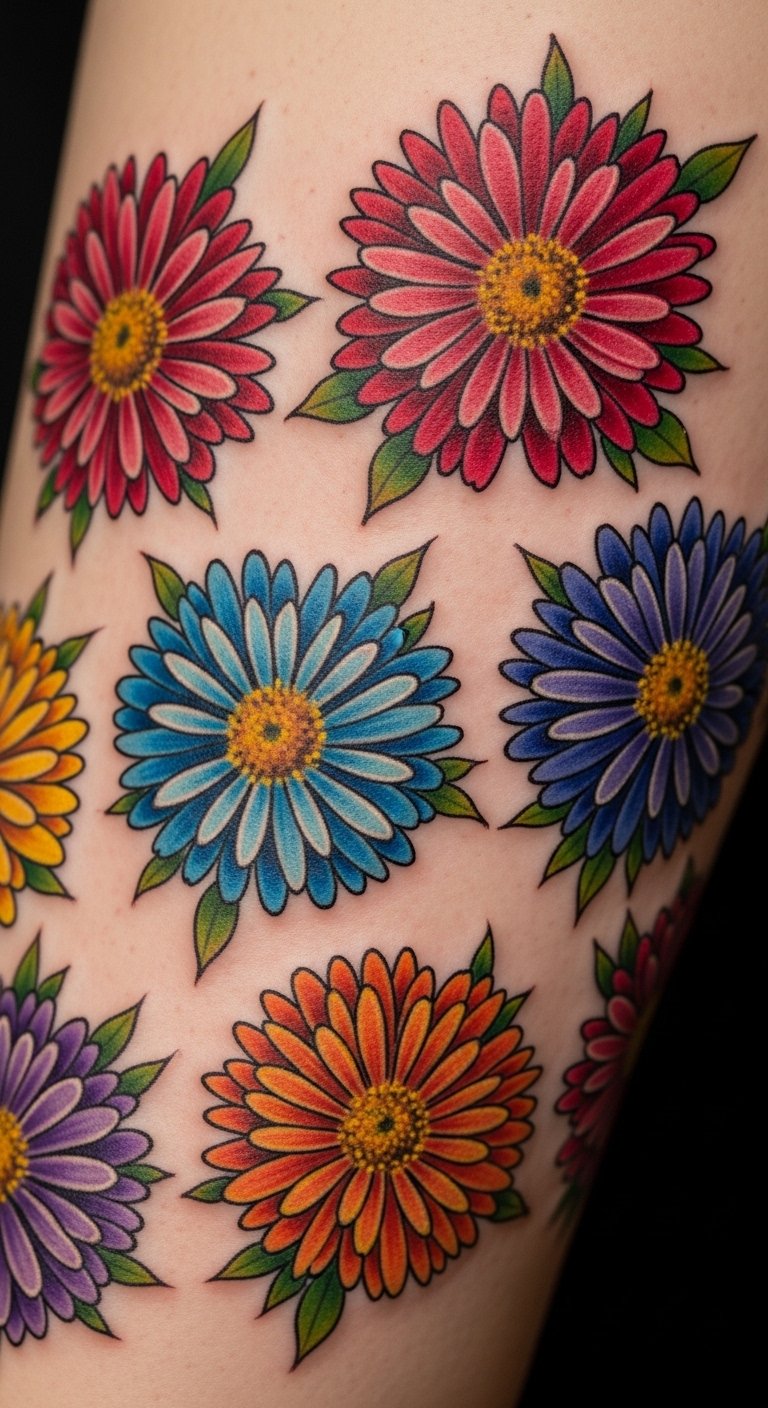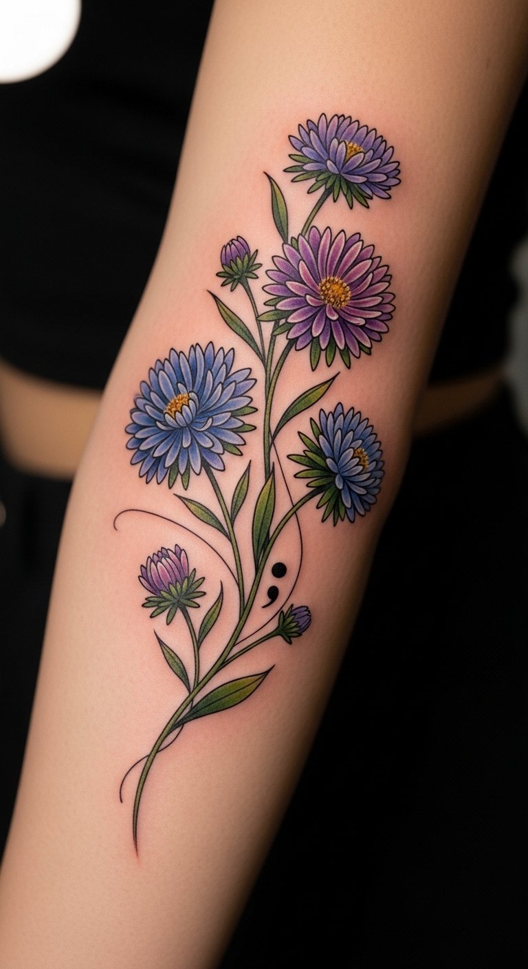 Blue asters stand for loyalty, a key to building resilience over time. This color choice turns your tattoo into a badge of trust in yourself. Create a mock-up at home with blue markers and flower templates you print for free. Find an affordable parlor offering color work for less than $80. Position it on your ankle for a reminder during walks or runs. Try a DIY practice by drawing on fabric scraps to see how blue pops. Use this design to celebrate overcoming challenges, like finishing a project. Keep it small to save on ink costs.