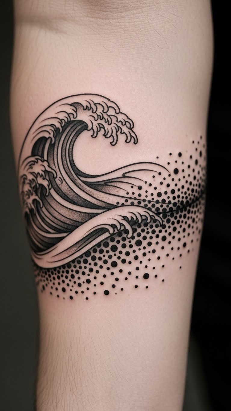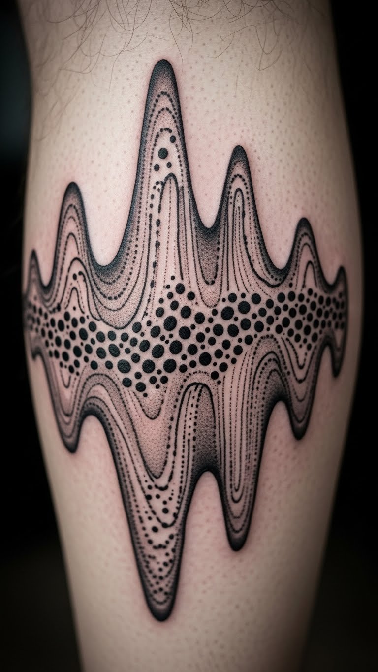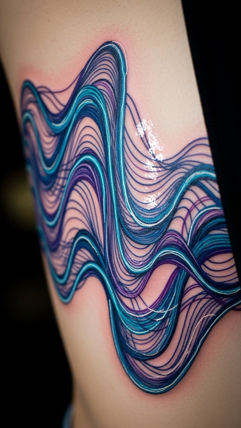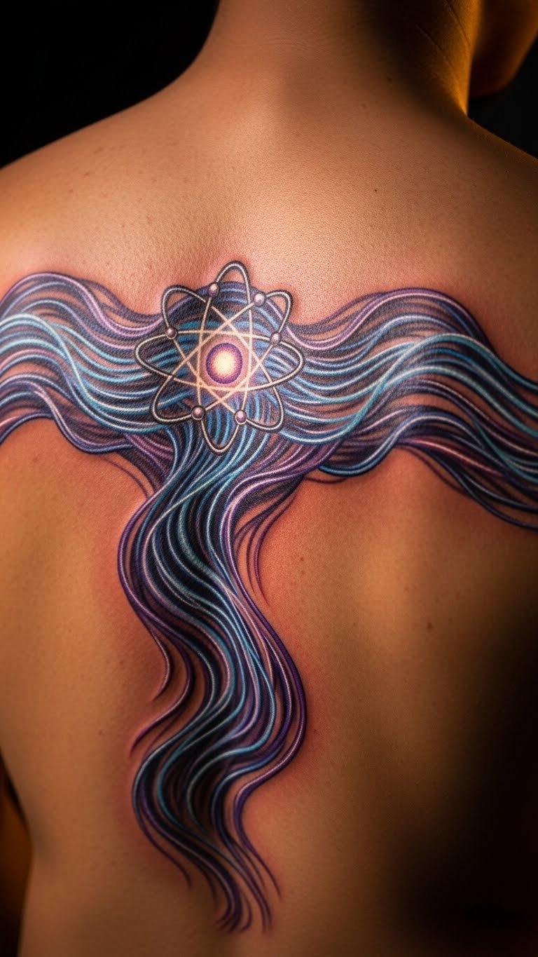 This design uses waves to show quantum ideas. Electrons as waves create a fluid tattoo. Great for science buffs.