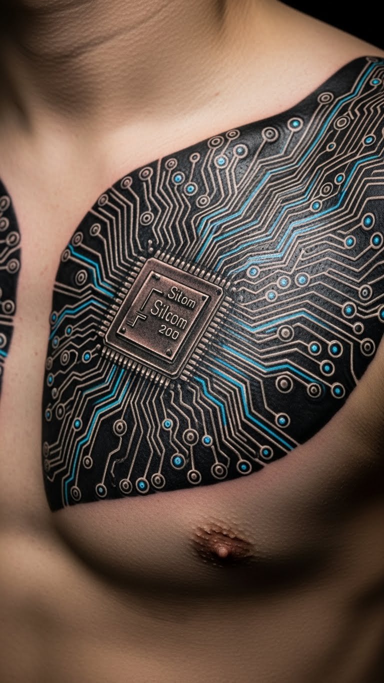 Silicon with tech elements. Circuits and orbits mix. For innovators.