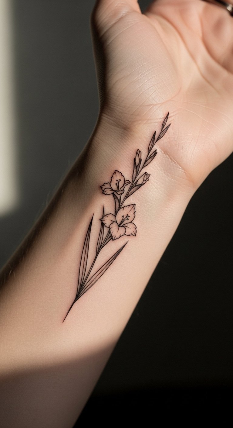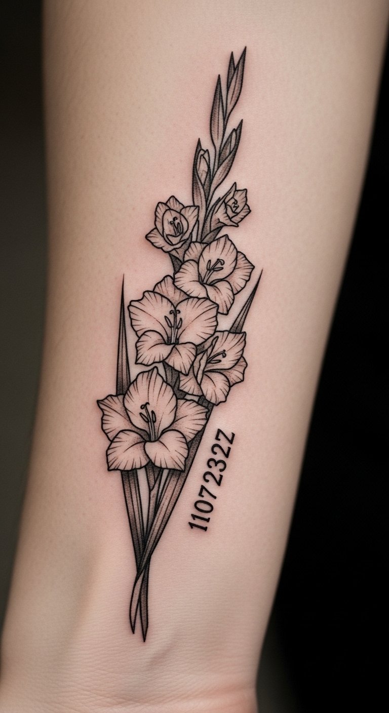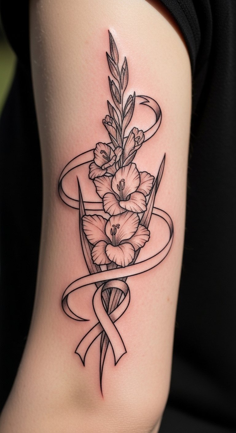 Add a ribbon to Gladiolus on your arm. It ties in extra meaning. Sketch the ribbon around the flower. Make it wave. Search for element artists around $140. Keep it flowing. Bold the key: ribbon tie. Ideas: Sketch on paper. Add waves quick. Bring your plan. They incorporate it. Simple add-ons cut costs. Try ribbon drawings. Draw and wrap. See the effect. This helps a lot. Personalize your ink.