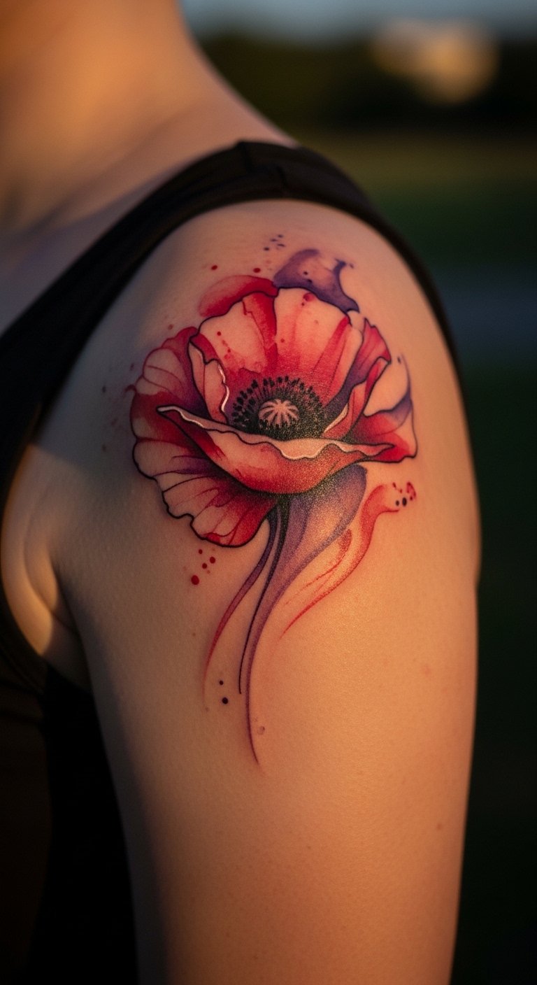 Go for a watercolor Poppy on your shoulder. It adds a soft touch of peace. Use watercolors at home to experiment. Paint a quick flower on paper. Search for artists who do this style affordably, around $180. Blend colors lightly. Bold the key: shoulder peace. Break it up: Get paints cheap. Try a few strokes. Take a photo to share. Artists love that. Pick two colors max to cut expenses. It still shines bright. Test with body paint from a store. Apply and pose in the mirror. Check the vibe. This method keeps things real. Your tattoo will feel alive.
