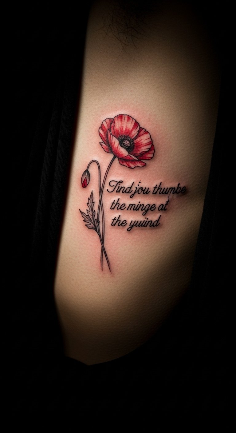 Add a quote to your Poppy tattoo. Place it on the ribs for a personal feel. Write words on paper first. Choose something meaningful. Find artists who add text for about $160. Keep the quote short. Bold the key: quote memory. Start simple: Jot down phrases. Pick one that fits. Show it during your visit. They adjust easy. Use basic fonts to save money. No need for fancy. Try temporary transfers with words. Stick and read it daily. Test the spot. This keeps it practical. Your ink tells your tale.
