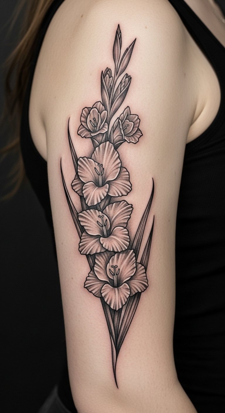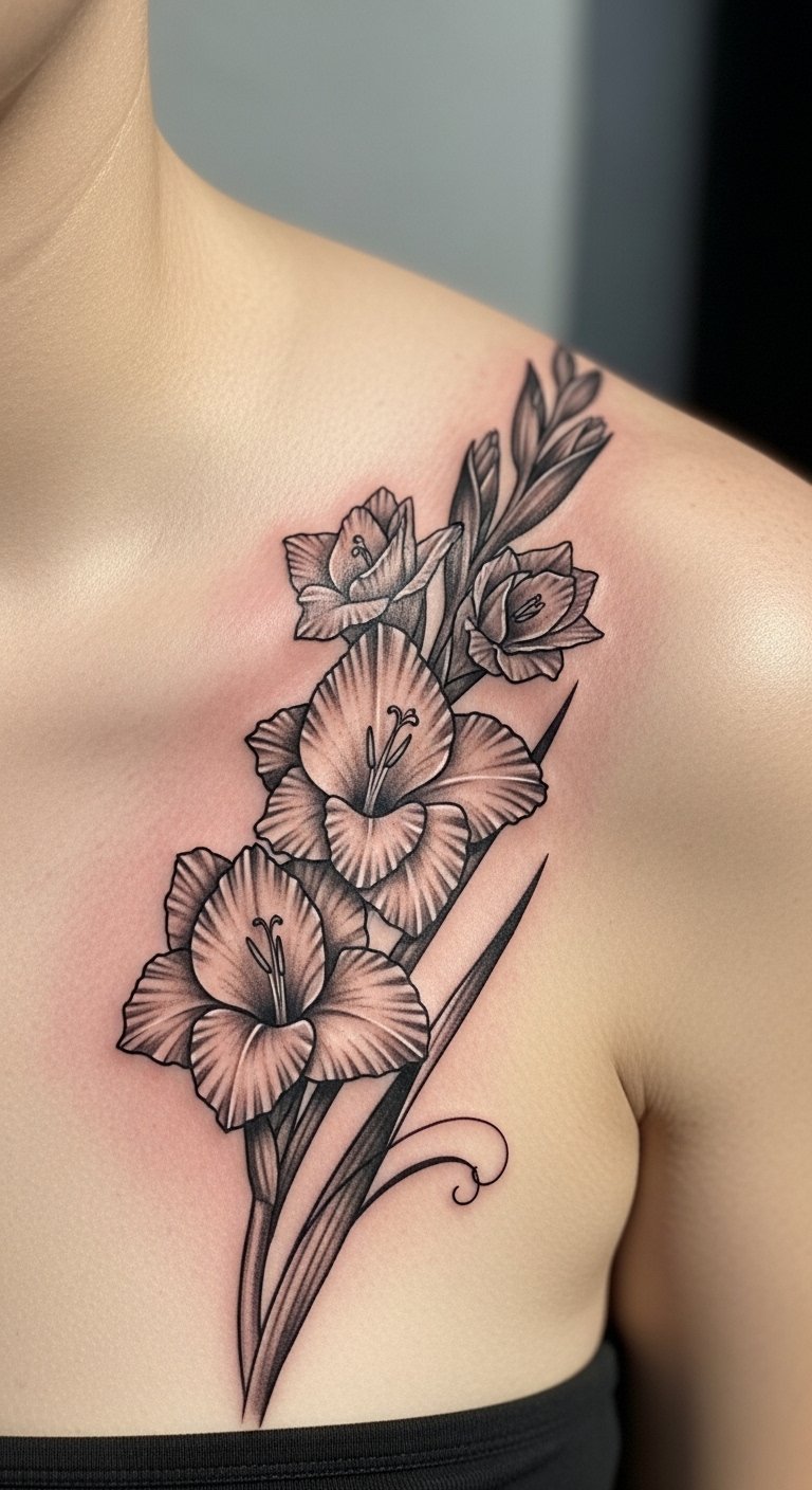 Opt for black and gray Gladiolus on your chest. It highlights inner power. Sketch with a gray pencil at home. Keep details minimal. Search for studios that do grayscale for $140. Shade lightly for effect. Bold the key: gray power. Quick tips: Get a pencil. Draw shades fast. Take it to the shop. They make it better. This style is budget-friendly. No colors mean lower price. Use charcoal sticks to preview. Rub on paper and check. See the depth. It works wonders. Wear your strength close.