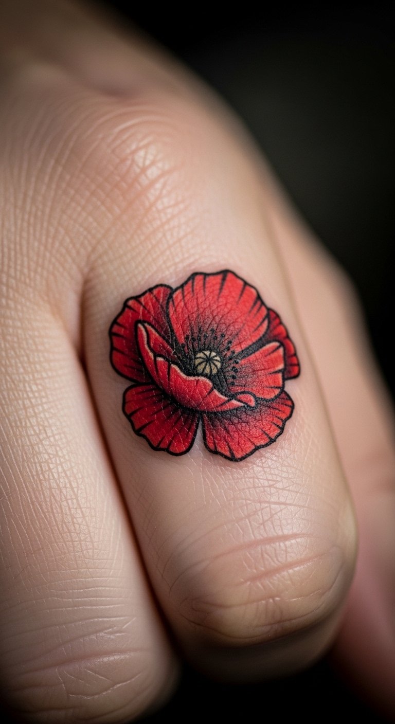 A red Poppy on your finger is bold yet subtle. It represents quick remembrance. Draw a tiny petal on paper. Use red markers. Find finger tattoo experts for $90. Keep it small. Bold the key: finger memory. Steps: Markers work fine. Sketch fast. Take to the artist. They scale it. Single color keeps costs low. It’s vibrant and simple. Try nail art stickers. Stick on and move. See daily use. This tests well. Wear your symbol proudly.