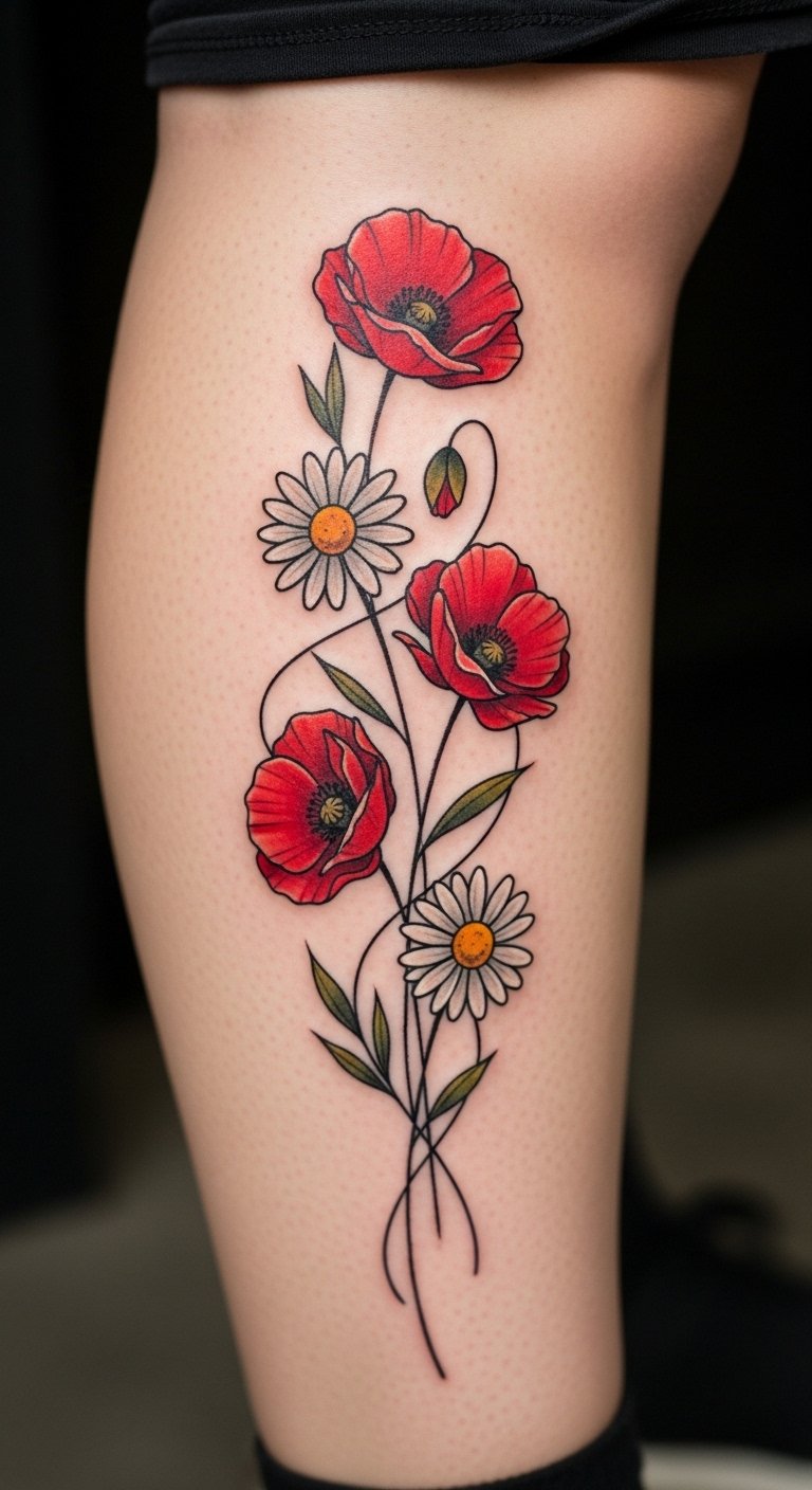 Mix Poppy with Daisy on your leg. It blends months beautifully. Sketch both on a page. Make them connect. Find mix artists for $150. Keep lines basic. Bold the key: flower mix. Tip: Start drawing. Combine quick. Bring to session. They refine it. Two flowers add meaning without high cost. Try garden sketches. Draw from photos. See the blend. This helps decide. Celebrate your story.