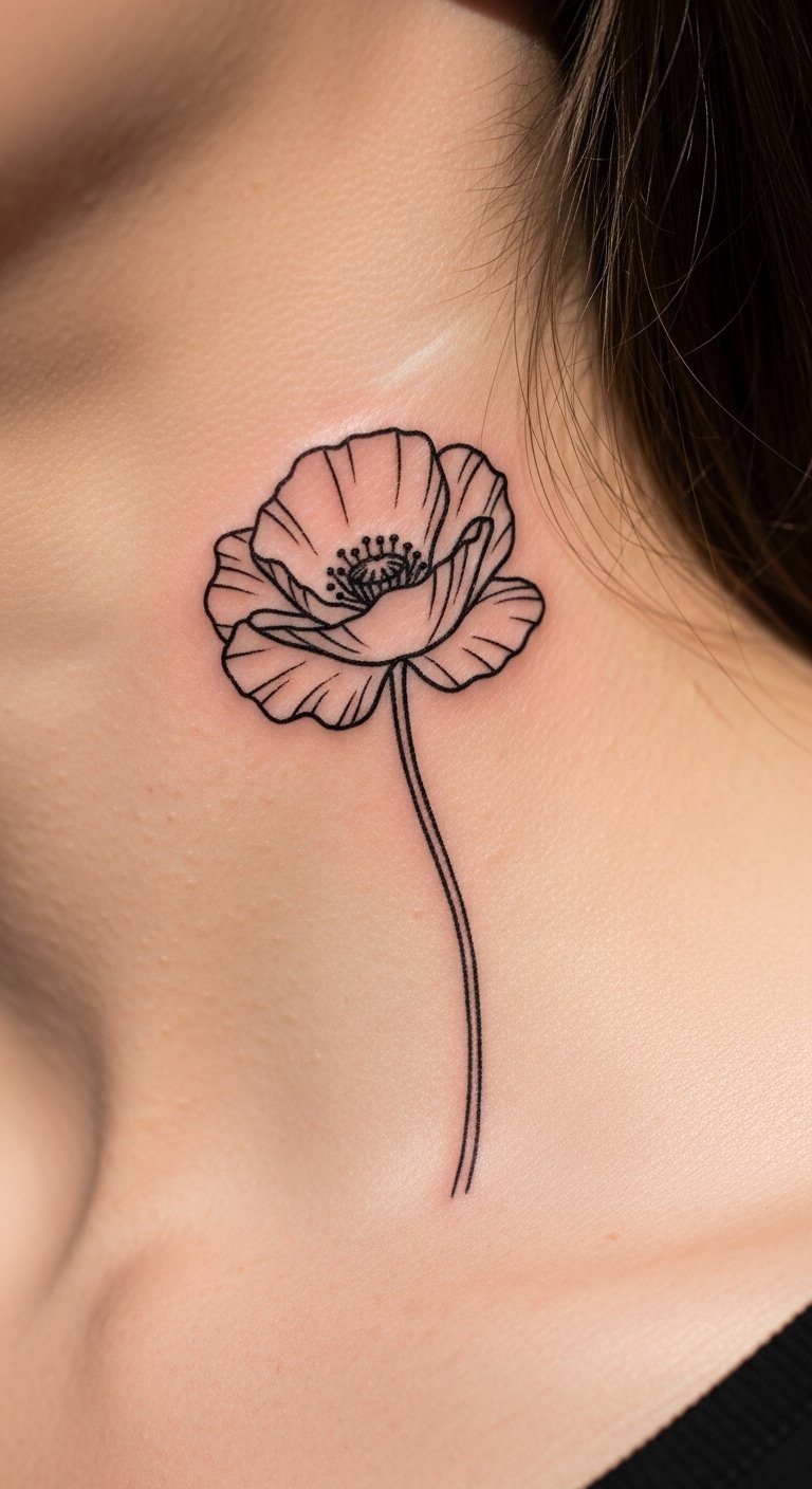 A simple Poppy outline on your neck is elegant. It means peaceful recall. Draw outlines with a pen. Keep it clean. Find outline specialists for $80. Add no extras. Bold the key: neck peace. Start: Pen and paper. Outline fast. Take to shop. They clean it up. Basic lines are budget-friendly. Easy healing. Use outline stickers. Apply and view. See the spot. This tests perfectly. Keep it meaningful.