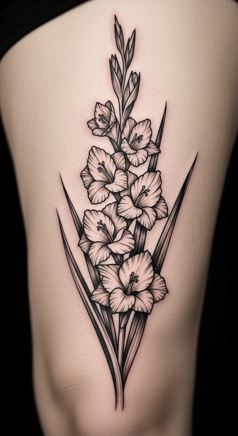 Go for a full Gladiolus bloom on your thigh. It represents full strength. Draw the whole flower on paper. Add petals. Look for detailed work around $180. Fill it out. Bold the key: bloom strength. Steps: Paper drawing. Add details fast. Take to session. They fill in. Full designs are worth it. Try full sketches. Draw and expand. Check the size. This guides you. Show your growth.