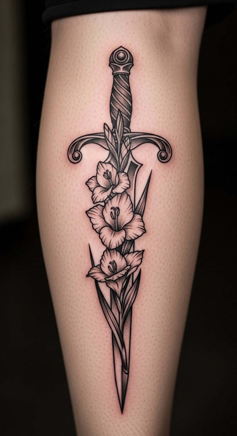 Make Gladiolus like a sword on your calf. It amps up the strength. Draw the blade shape. Add edges. Search for motif pros around $150. Sharpen it. Bold the key: sword form. Quick: Shape on paper. Draw edges fast. Show the artist. They craft it. Motif keeps costs down. Try blade cutouts. Cut and place. Check the fit. This inspires. Wield your power.