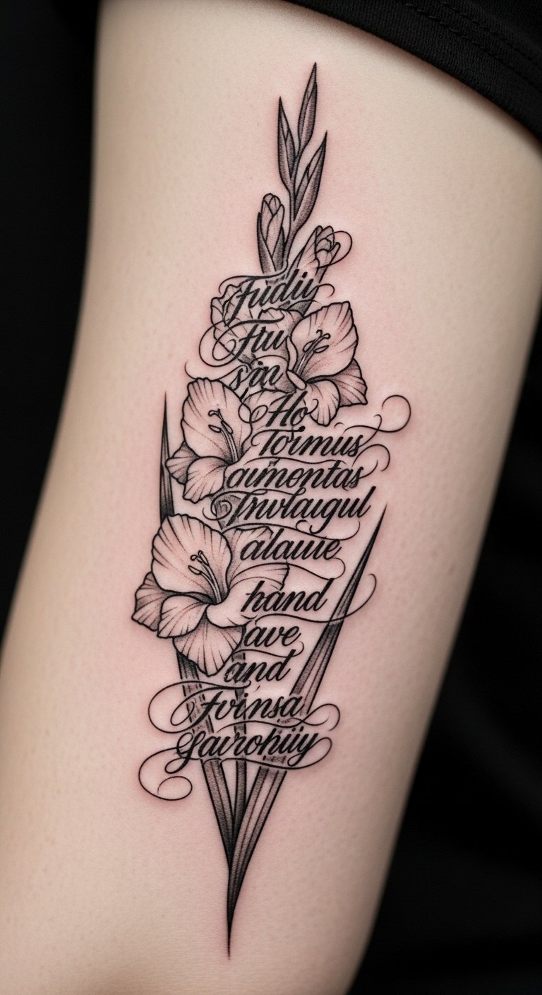 Fuse Gladiolus with a quote on your arm. It merges strength and words. Write quote under the flower. Blend them. Look for fusion artists around $160. Tie it together. Bold the key: fusion words. Ideas: Quote and flower. Sketch together. Take to shop. They fuse it. Combined elements save on separate sessions. Try word art. Write and draw. Check the mix. This helps create.