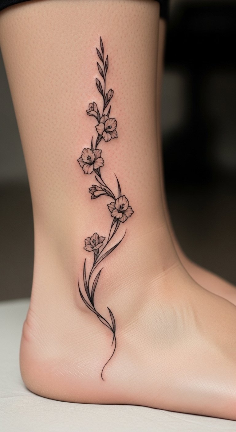 Add a vine to Gladiolus on your ankle. It winds with strength. Draw the stem and flowers. Make it curve. Find vine pros for $120. Let it grow. Bold the key: vine path. Step: Stem on paper. Add curves quick. Show your vine. They extend it. Vine design is cost-effective. Use vine strings. String and trace. See the route. This guides you. Grow your symbol.