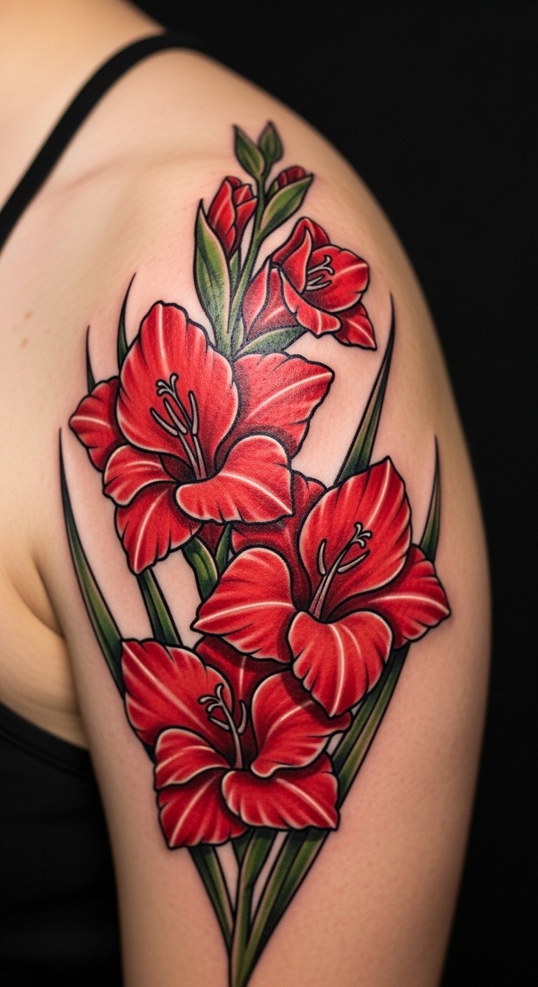 Make your Gladiolus bold in red on the shoulder. It stands for fierce strength. Color the petals red on paper. Add lines. Search for bold work around $170. Make it pop. Bold the key: red strength. Tip: Red markers. Color quick. Bring your bold sketch. They amplify it. Red ink adds impact without breaking the bank. Try red fabrics. Drape and view. See the effect. This sparks ideas.