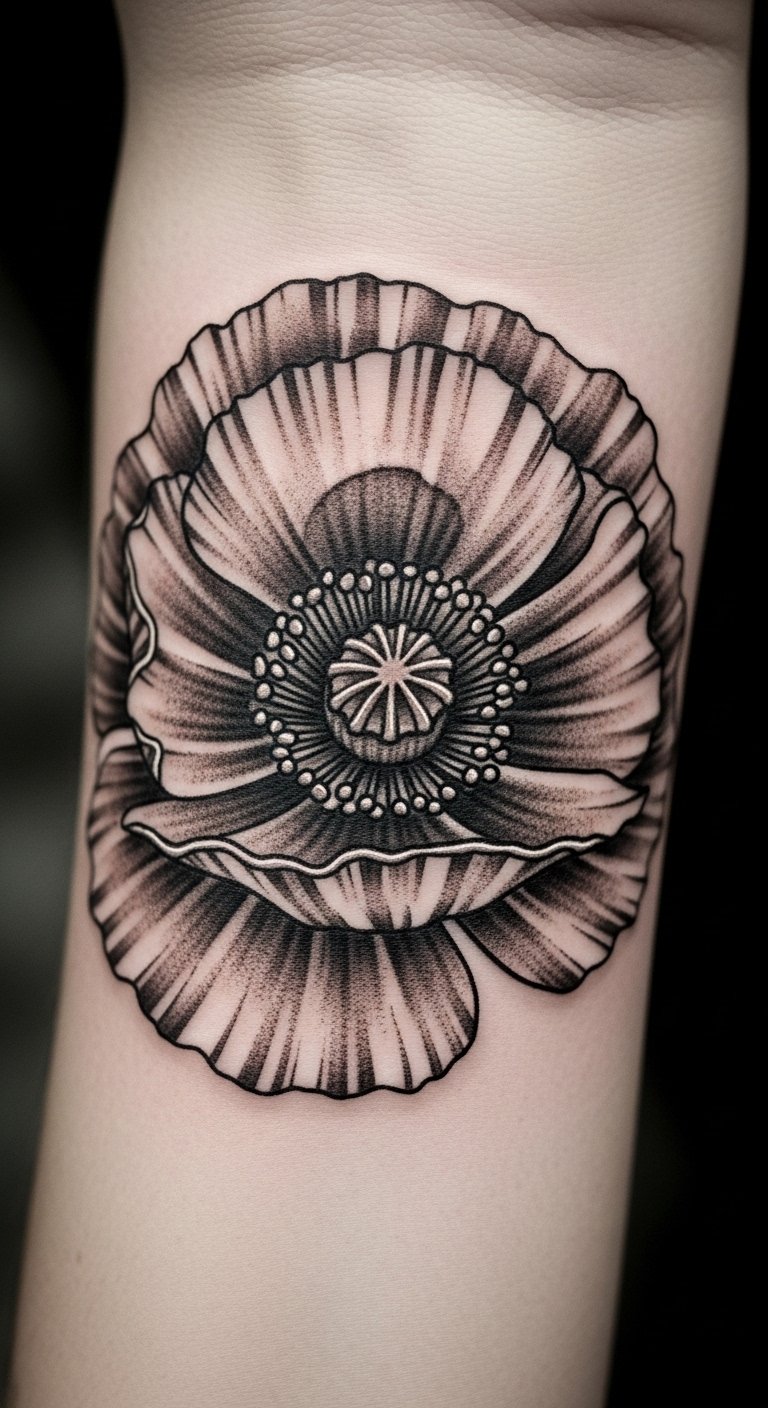Focus on the Poppy center on your wrist. It highlights core remembrance. Shade the middle on paper. Keep it central. Find focus artists for $90. Detail the heart. Bold the key: center core. Idea: Shade center. Draw focused. Take to session. They spotlight it. Central design saves space and money. Use magnifying tools. Zoom and sketch. Check the detail. This clarifies.