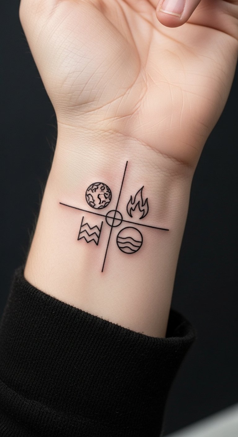 Four elements tattoos keep it minimal for daily use. Outline elements quickly. Edit with free software. Choose basic inks low-cost. Put them on wrists for access. Add a connecting line. Use simple stencils. This style clarifies your path. Draw them fast. Select practical spots.