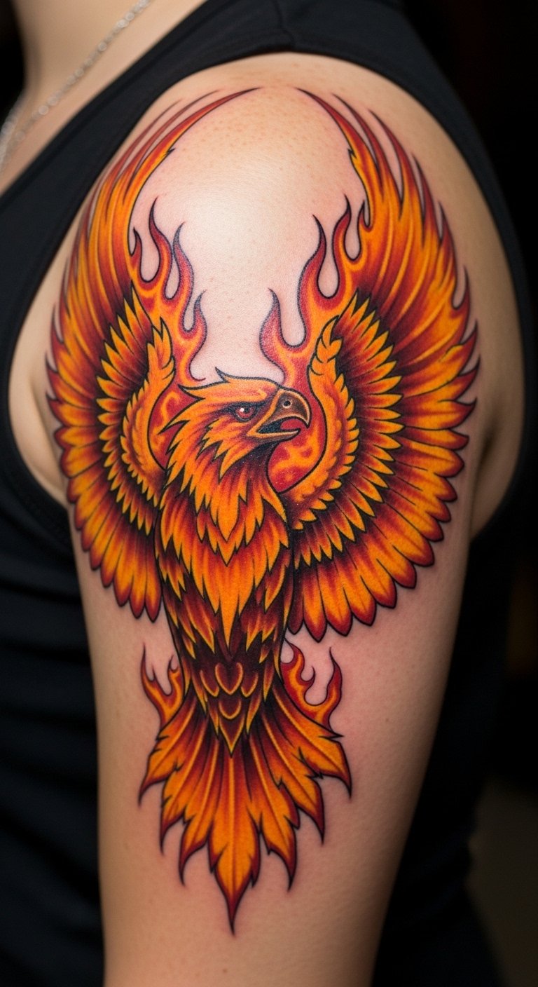 Birds of fire signify rebirth. Draw simply. Use low-cost tests. Put on shoulder for renewal. Add flames. Go economical. It sparks comebacks. Advice: Connect to fresh starts. Find artists nearby. Rise from ashes.