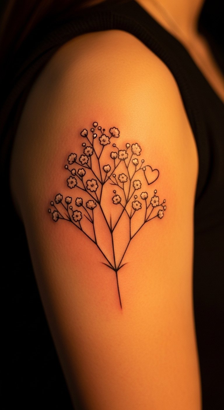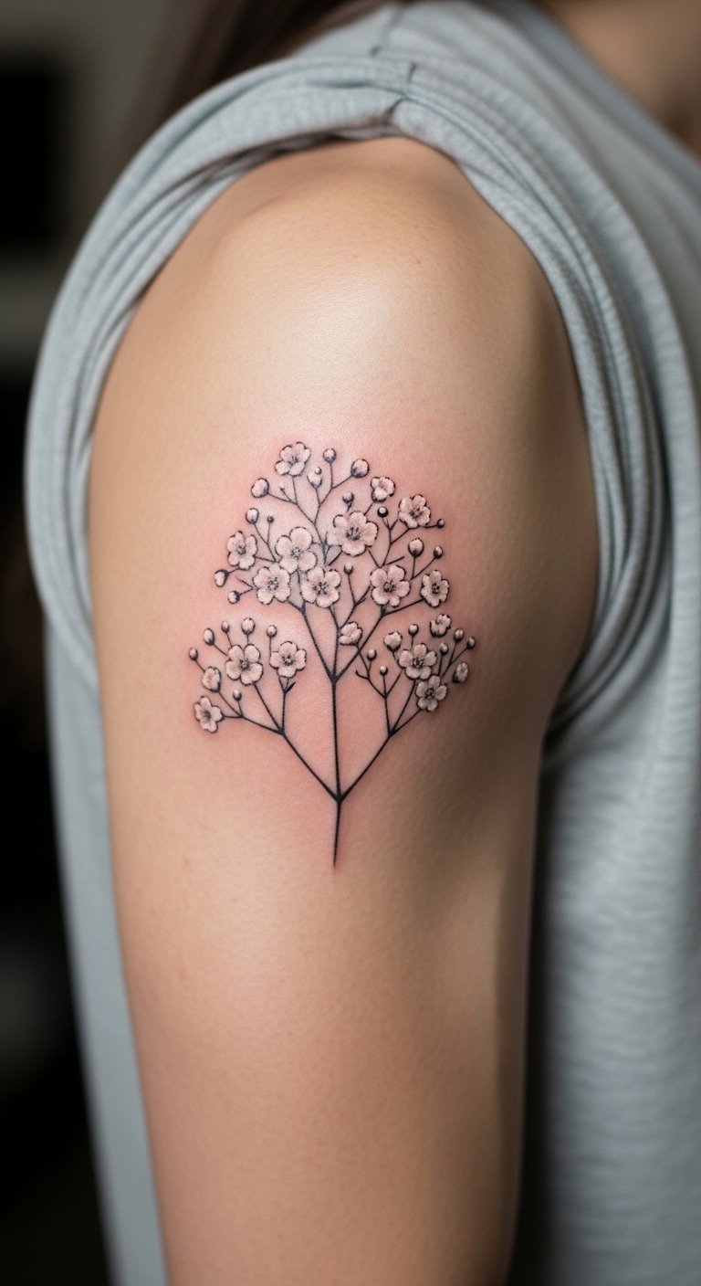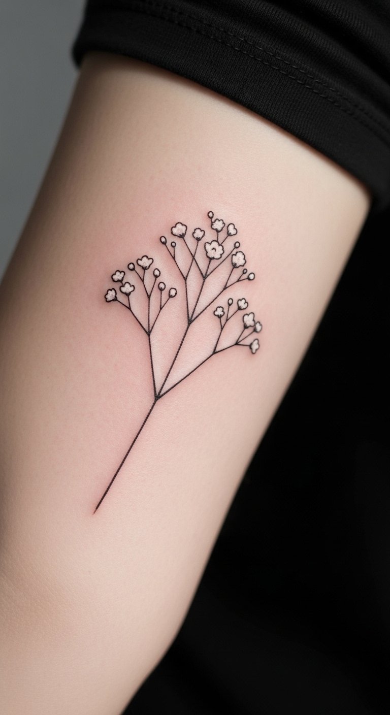 An upper arm baby’s breath cluster tattoo stands out with strength. View it as a group of flowers flowing down your limb. This spot allows for bold yet flexible art. Draw grids on paper to plan the layout. Use free software to arrange clusters digitally. Expect costs around $110 from nearby parlors. Add shading with basic tools for a personal touch. Practice drawing circles to mimic flowers at home. It’s great for showing off or covering up. Apply oil from your kitchen to keep skin healthy. This idea works for active lifestyles.