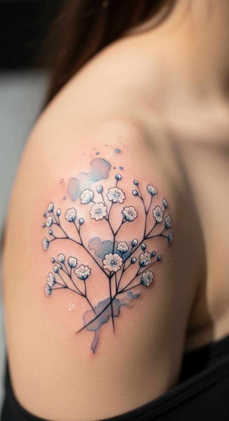 A watercolor baby’s breath cluster brings an artistic twist to your skin. Imagine soft, blended hues forming flower groups on your arm. This method mimics a painting for a dreamy feel. Start at home by coloring simple drawings with markers. Practice on paper to get the flow right. Download free drawing software on your phone for quick edits. Choose an artist who uses affordable water-based inks, around $150 total. Place it on your shoulder for easy coverage. Add a few drops of color for personalization without raising the price. Use online tutorials to learn basic shading techniques. These last for years with proper care, like daily lotion application. Pick a spot that sees less sun to keep colors bright.