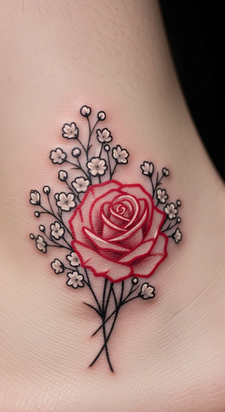 A baby’s breath with rose tattoo symbolizes love in a heartfelt way. Think of white flowers next to a bold rose on your ankle. This combo adds layers of meaning without complexity. Sketch both elements on paper to see how they fit. Use household items like string to outline shapes on your skin. Free websites offer rose templates for inspiration. Look for artists offering package deals, starting at $80. Position it low for a romantic touch that stays hidden. Mix in a small leaf for detail on a budget. Watch YouTube videos on drawing pairs like this at home. The design works for anniversaries and fits under clothing. Apply sunscreen to protect it from fading fast.