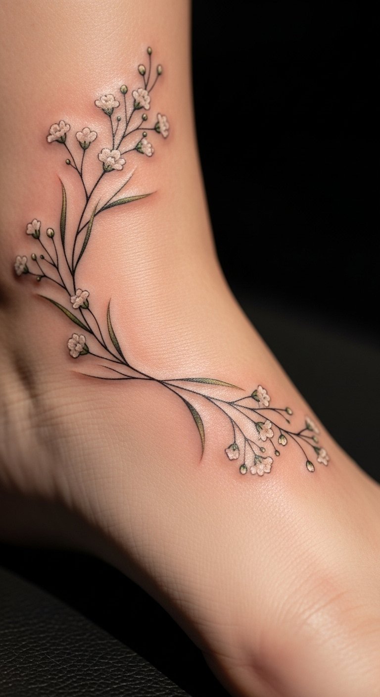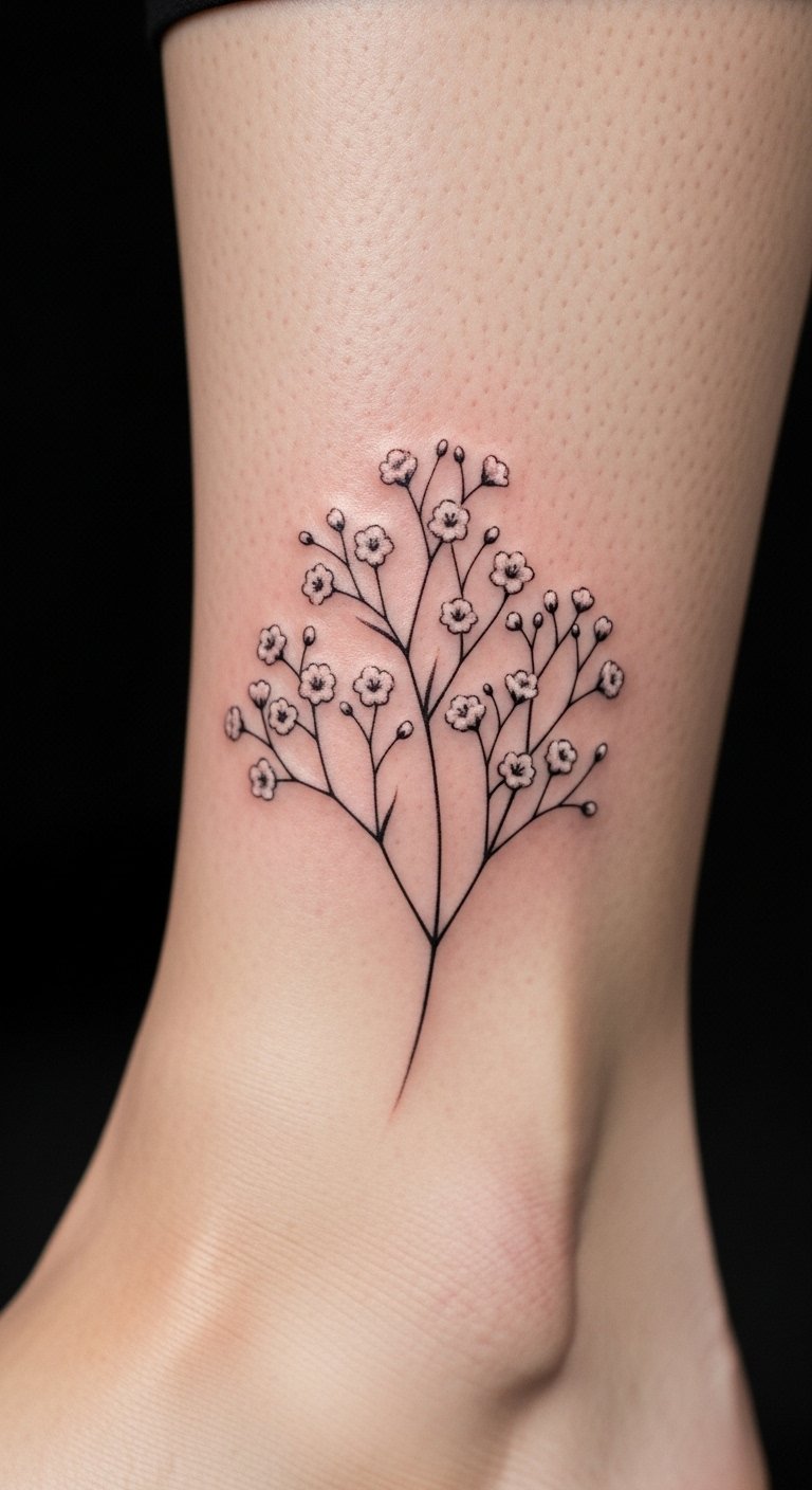 A discreet ankle baby’s breath tattoo offers a subtle option for everyday wear. Envision tiny flowers wrapping around your bone for a personal secret. This spot draws less attention and heals fast. Trace the design on your leg with a washable marker first. Practice with free printable stencils from the web. Artists in your area might charge only $60 for small pieces. Add a thin line to enhance it without extra fees. Use phone apps to snap mock-ups and adjust size. This placement pairs with sandals or socks easily. Moisturize the area daily with basic cream from your cabinet. It’s ideal for those wanting something meaningful yet low-key.
